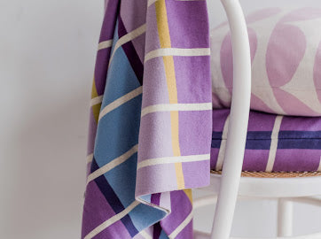 Decken und Kissen sind Strickwaren, hergestellt in der Jacquardtechnik. Es wird mit bunten Fäden gearbeitet, die beim Farbwechsel kunstvoll verkreuzt werden. Diese Umkehrung der Farben schafft einen umwerfenden grafischen Effekt mit verschiedener Vorder- und Rückseite.