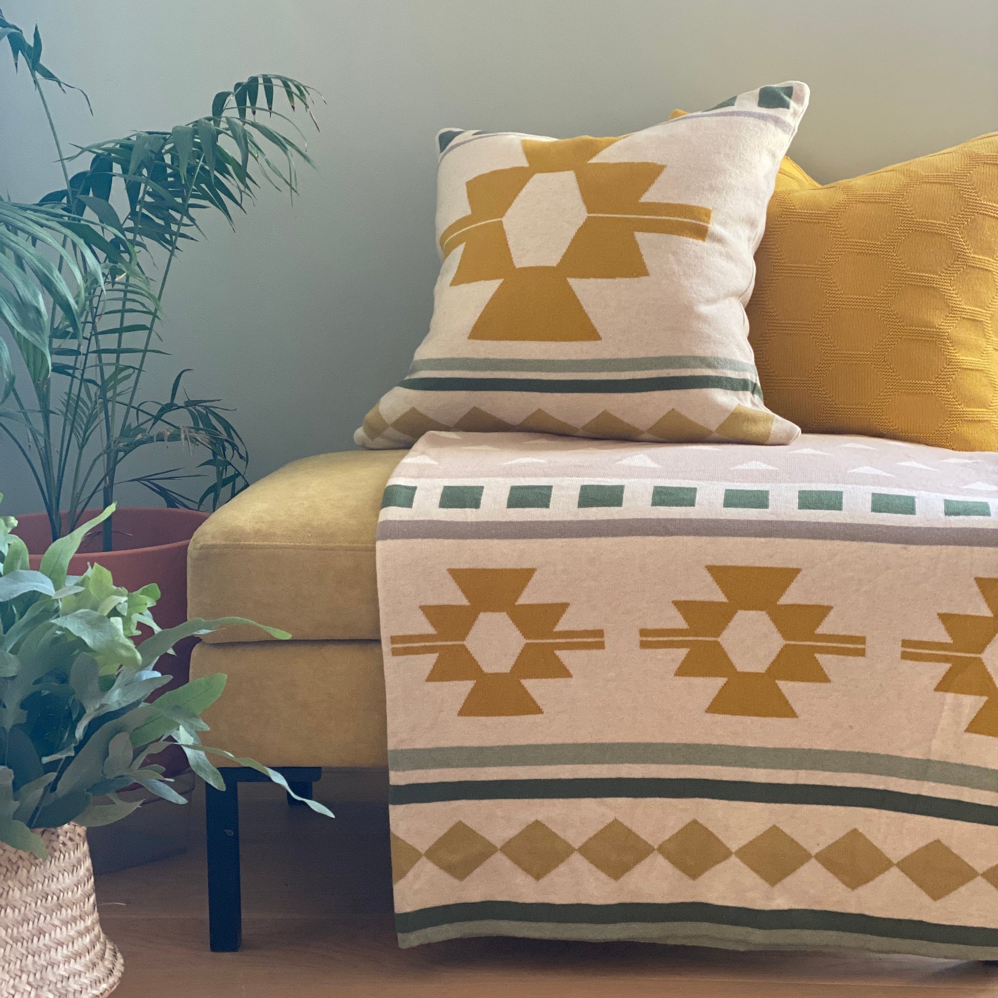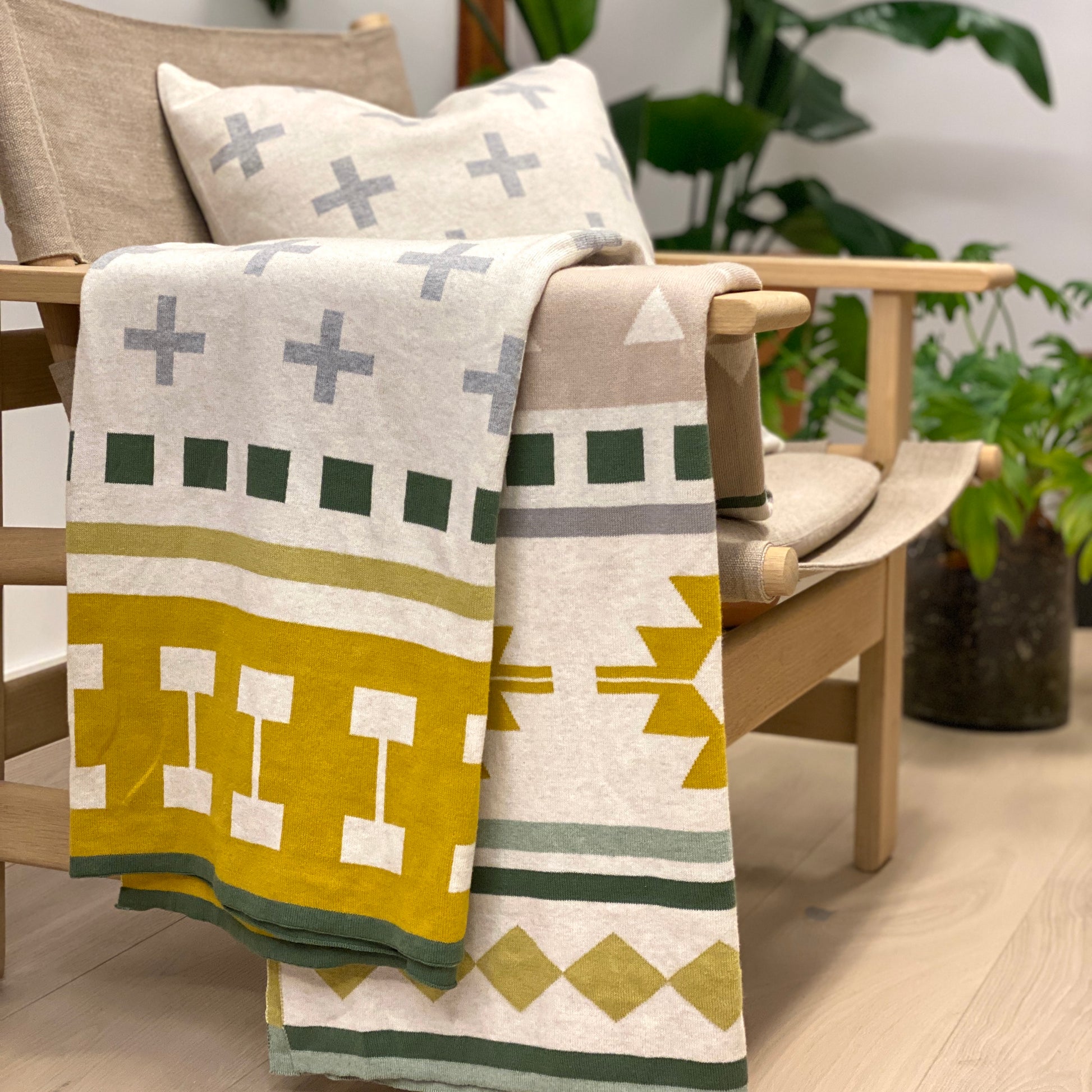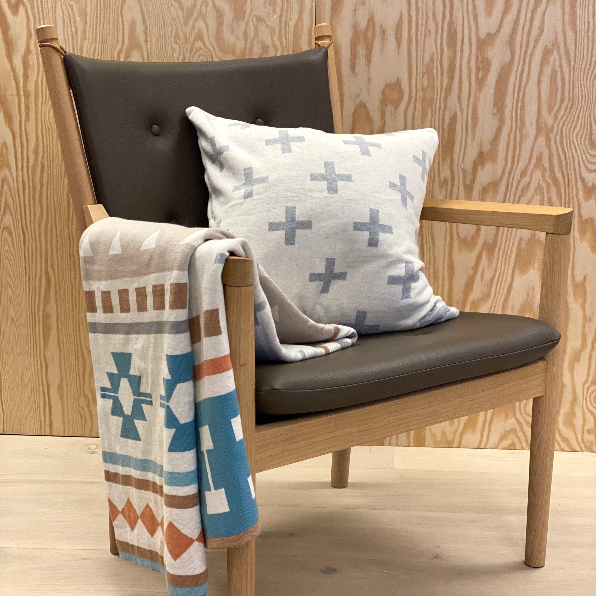 Decken und Kissen Don sind Strickwaren, hergestellt in der Jacquardtechnik. Es wird mit bunten Fäden gearbeitet, die beim Farbwechsel kunstvoll verkreuzt werden. Diese Umkehrung der Farben schafft einen umwerfenden grafischen Effekt mit verschiedener Vorder- und Rückseite.