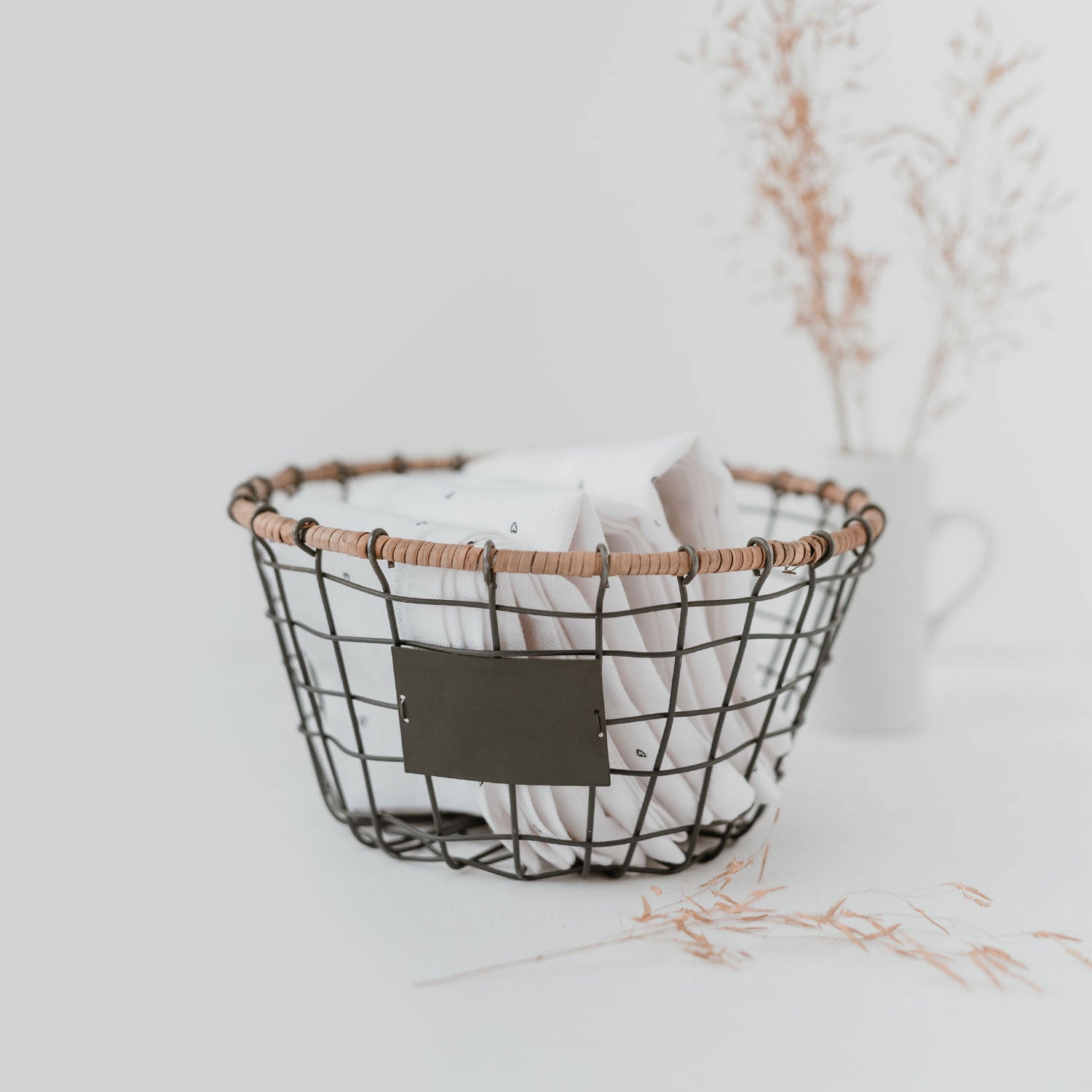 So macht Aufbewahren und Sortieren so richtig Spaß – unseren Drahtkorb könnt ihr für jede Möglichkeit nutzen. Ob für Eure Vorräte, für Handtücher im Gästebad oder auch für eure Kleinigkeiten, die nicht mehr rumfliegen sollen! All unsere Körbe werden in liebevoller Handarbeit hergestellt. Der Kontrast zwischen dem Metall und dem Rand aus natürlicher Holzfaser geben ihnen das gewisse Etwas. Auf dem Drahtkorb selber befindet sich eine kleine Fläche für dich, damit du den Korb ganz nach deinen Wünschen beschriften kannst.