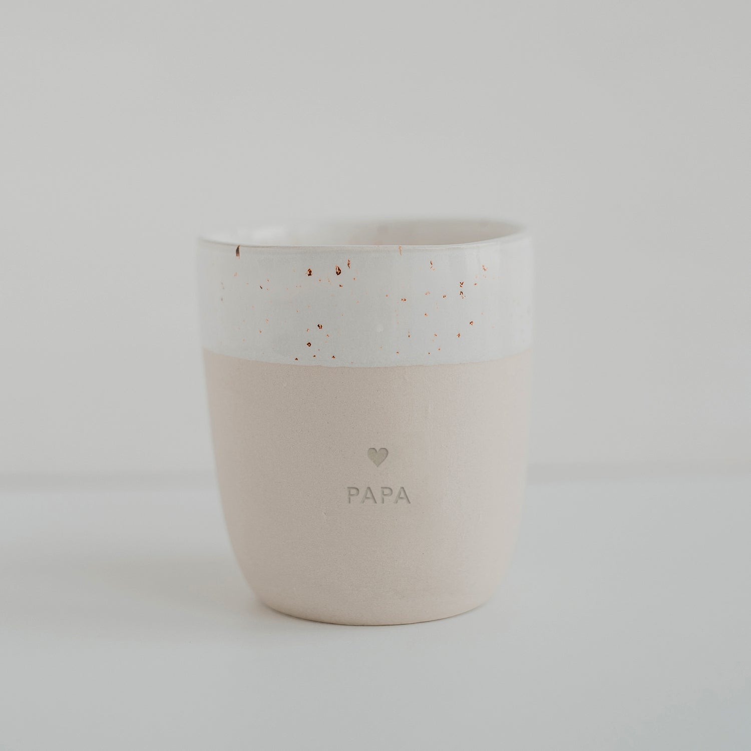 Wir haben sehr viel Herzblut in eine neue Kollektion gesteckt, die von der Form, dem Ton, dem Glazing, sowie dem Design von uns entwickelt wurde. Eine kleine Töpferei aus Portugal produziert diese wundervollen Becher in liebevoller Handarbeit & ist ein großartiger neuer Begleiter auf unserem kreativen Weg. Unsere Becher lassen die Herzen höher schlagen, die die Individualität von Ton & Glasur lieben, denn jeder einzelne Becher hat seinen ganz eigenen Touch. Da alle Becher mit der Hand gefertigt, gebrannt, geprägt, abgeschliffen, geglazt & nochmal gebrannt werden, gibt es Unterschiede in der Drucktiefe, in der Höhe sowie der Geradlinigkeit. Das minimalistische Design und die natürlichen Farbnuancen werden von einer wunderschönen Blindprägung “Mama” abgerundet. Wir sind verliebt & voller purer Freude & können es kaum abwarten unsere neue Kollektion in Euren Händen zu sehen! Unser Becher Papa ist das perfekte Geschenk für jeden Papi !