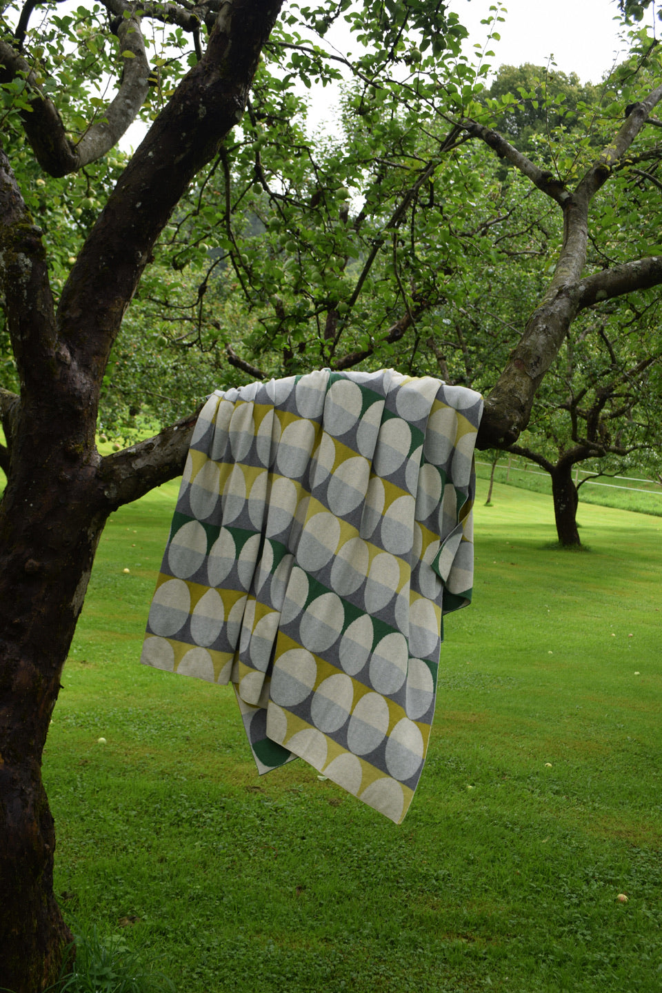 Decken und Kissen Don sind Strickwaren, hergestellt in der Jacquardtechnik. Es wird mit bunten Fäden gearbeitet, die beim Farbwechsel kunstvoll verkreuzt werden. Diese Umkehrung der Farben schafft einen umwerfenden grafischen Effekt mit verschiedener Vorder- und Rückseite.