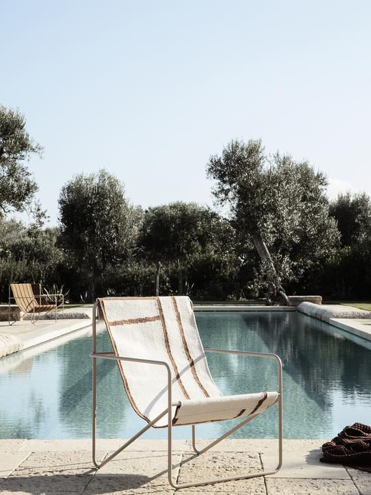 Der Desert Chair, ein modernistischer Stuhl mit anmutigem Profil, besteht aus einem rohrförmigen pulverbeschichteten Stahlrahmen in den Farben Schwarz oder Kaschmir, der den auswechselbaren gewebten Textilsitz aus recycelten Kunststoffflaschen trägt. Der Sitz ist in vier Ausführungen erhältlich: Soil, Stripes, Shapes oder Solid Cashmere. Der Stuhl ist sowohl für den Innen- als auch Außenbereich geeignet, und das Lounge-Design lädt zum Entspannen sein. Einfach zurücklehnen und genießen.