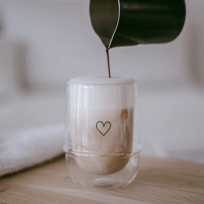 Das perfekte Latte Macchiato Glas für deinen Lieblingskaffee - unser doppelwandiges Glas Herz mit einem Füllvolumen von 340ml.