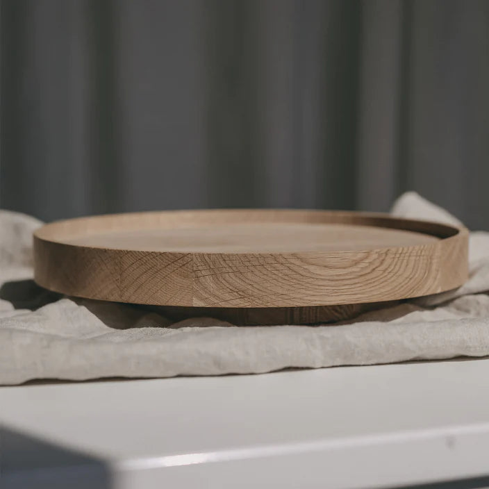 Unser Drehteller aus Eiche ist nicht nur ein absoluter Hingucker, sondern dazu noch ein Aufräumtalent. Mit seinem Durchmesser von 28 cm macht er sich perfekt in Küchenschränken und Regalen. Wir nutzen ihn für Öle und Gewürze, die sich durch das Drehen des Tellers, leichter aus dem Schrank entnehmen lassen. Auch als Kaffeestation für Zucker, Milchkännchen und Becher ist der Drehteller perfekt geeignet. Durch eine Kante werden die sich drehenden Gegenstände vor dem Verrutschen geschützt. Auf der Unterseite sind kleine Gumminoppen eingearbeitet, sodass auch die Drehplatte am Platz gehalten wird.