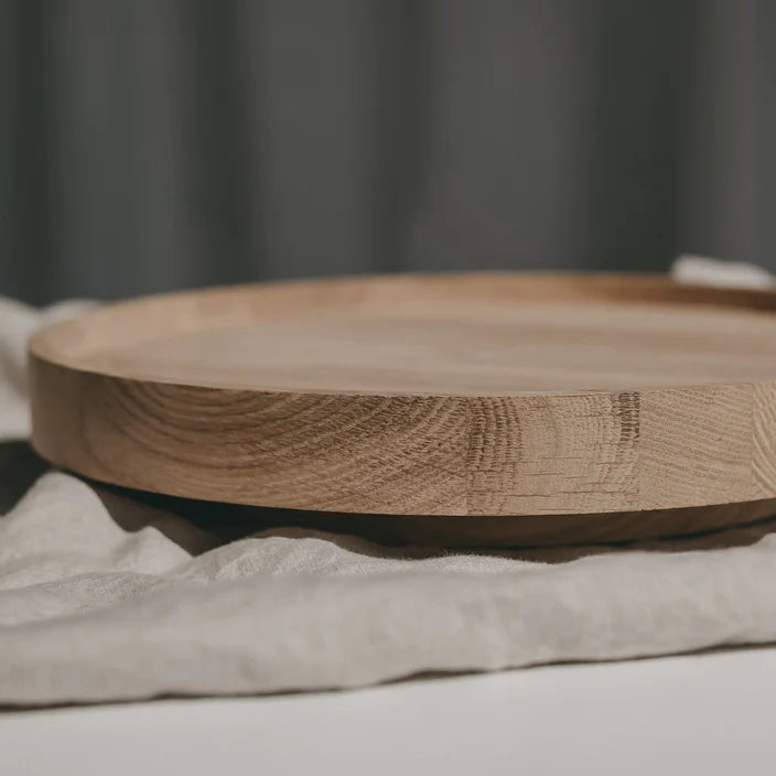 Unser Drehteller aus Eiche ist nicht nur ein absoluter Hingucker, sondern dazu noch ein Aufräumtalent. Mit seinem Durchmesser von 28 cm macht er sich perfekt in Küchenschränken und Regalen. Wir nutzen ihn für Öle und Gewürze, die sich durch das Drehen des Tellers, leichter aus dem Schrank entnehmen lassen. Auch als Kaffeestation für Zucker, Milchkännchen und Becher ist der Drehteller perfekt geeignet. Durch eine Kante werden die sich drehenden Gegenstände vor dem Verrutschen geschützt. Auf der Unterseite sind kleine Gumminoppen eingearbeitet, sodass auch die Drehplatte am Platz gehalten wird.