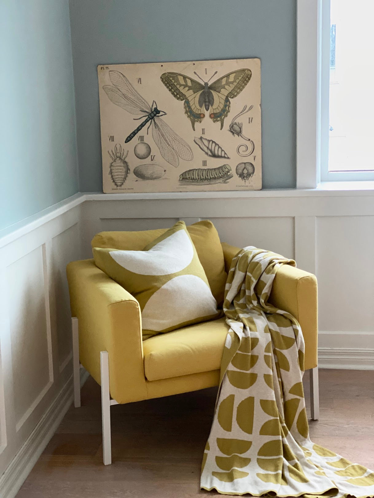 Decken und Kissen Ella sind Strickwaren, hergestellt in der Jacquardtechnik. Es wird mit bunten Fäden gearbeitet, die beim Farbwechsel kunstvoll verkreuzt werden. Diese Umkehrung der Farben schafft einen umwerfenden grafischen Effekt mit verschiedener Vorder- und Rückseite.