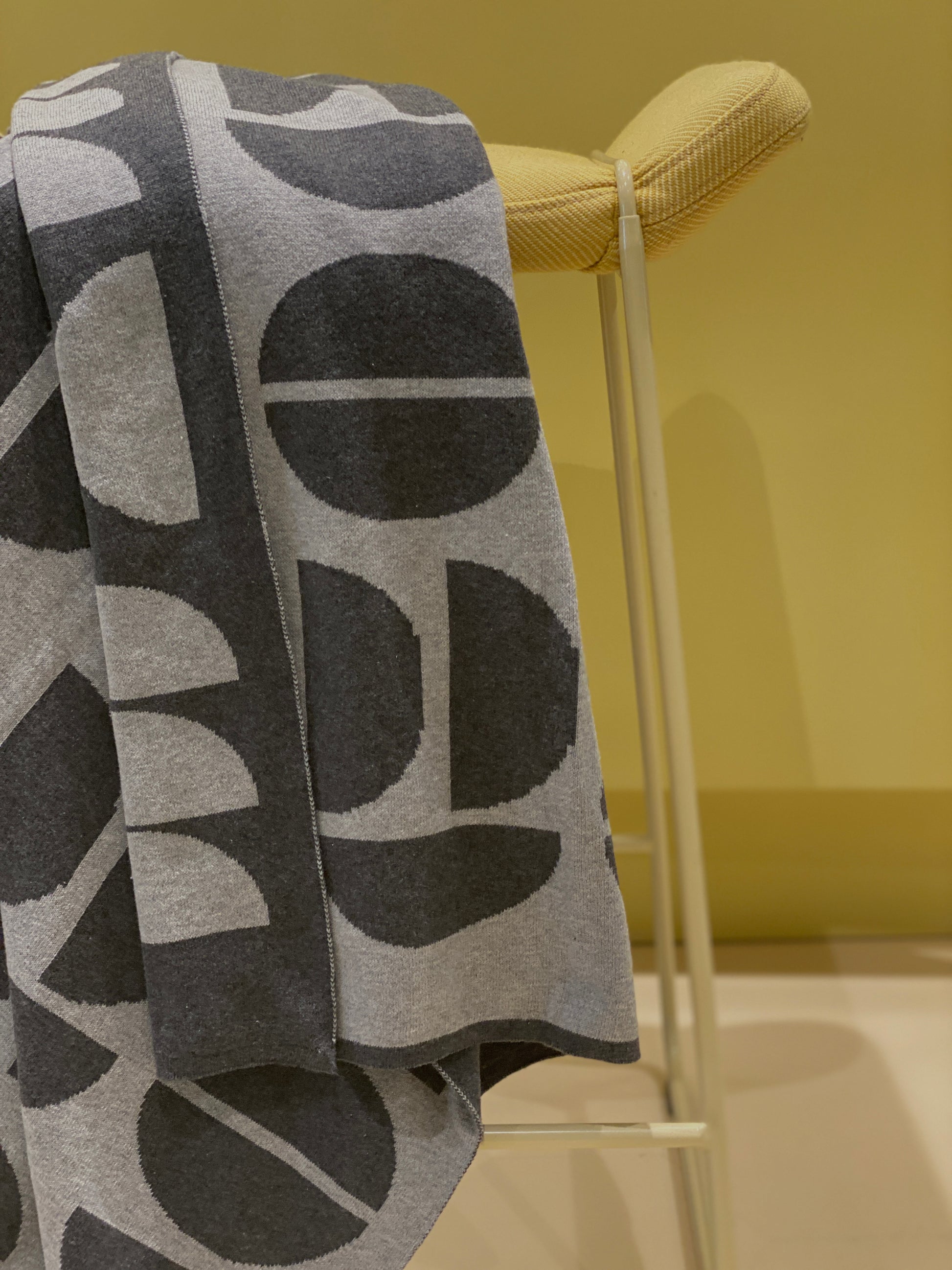 Decken und Kissen Ella sind Strickwaren, hergestellt in der Jacquardtechnik. Es wird mit bunten Fäden gearbeitet, die beim Farbwechsel kunstvoll verkreuzt werden. Diese Umkehrung der Farben schafft einen umwerfenden grafischen Effekt mit verschiedener Vorder- und Rückseite.