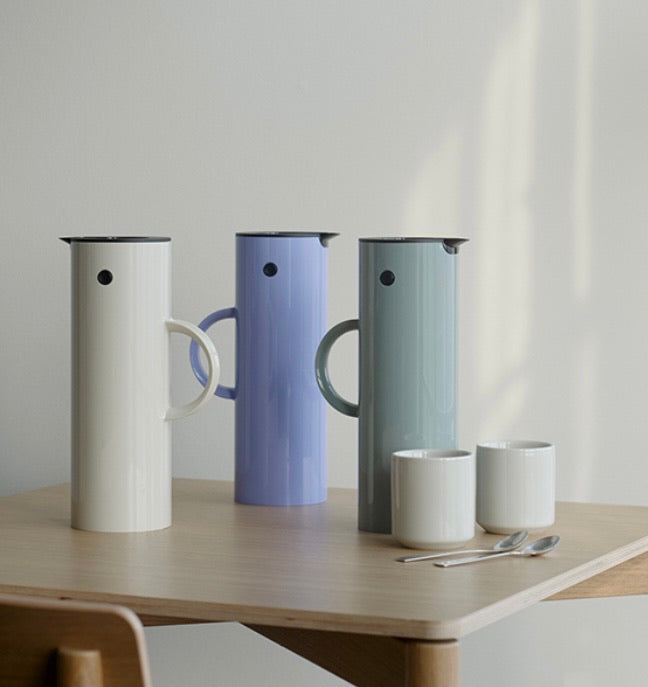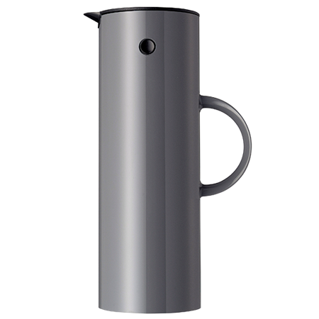 Während der Jahre wurde ein breites Farbspektrum der EM77, design Erik Magnussen, eingeführt, nach wie vor ist sie eine der meistverkauften Stelton Produkte weltweit. Der patentierte Kippverschluß ermöglicht eine Einhandbedienung. Zusätzlich gibt es zur Kanne einen Schraubverschluß als Transportverschluß.