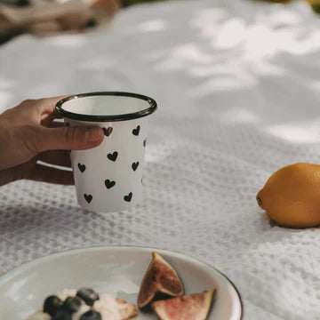Perfekt für dein nächstes Abenteuer, ob im Camper, beim Picknick im Park oder beim Grillen im Garten. Der Becher ist mit vielen kleinen schwarzen Herzen designt und ein echter Hingucker, zudem auch extrem robust und langlebig. Ideal für jegliche Outdoor-Aktivitäten und selbst auf einem Kindergeburtstag im Freien macht er eine gute Figur.