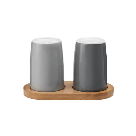 Das neue Emma Salz- und Pfefferset wird aus glasiertem Steinzeug in femininen Ton-in-Ton-Farben gefertigt und bildet einen hübschen Kontrast zur warmen Glut des Bambustabletts. Das Set ist in blau und grau erhältlich und passt zur übrigen Emma Serie.