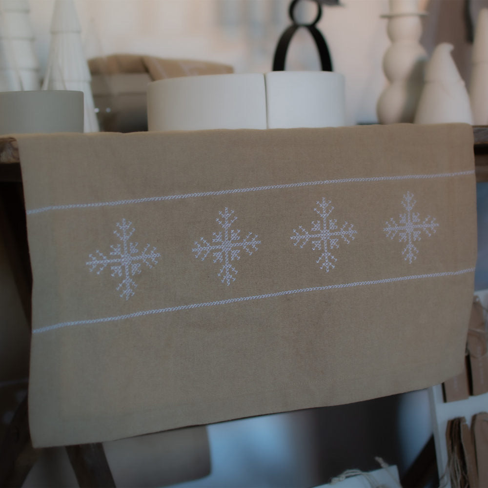 Tischläufer aus recycelten Textilien. Dunkelgrau mit weißem Kreuzstichmuster. Alle kleinen Details im Haus sind wichtig für das Ensemble. Wenn Sie einen Tischläufer über den Esstisch stellen, haben Sie eine schöne Tischdekoration geschaffen. Eine in der Länge oder mehr quer oder warum nicht als schönes Detail auf dem Couchtisch. Besonders schön für die Weihnachtsferien, um eine wundervolle Weihnachtsatmosphäre zu schaffen.
