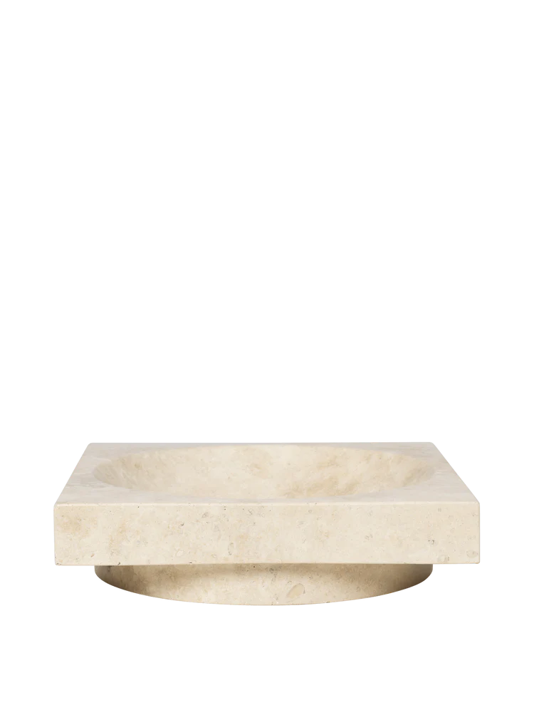 Die Hew-Serie ist eine Kollektion aus massiven Travertin-Designs, die skulpturale Schlichtheit mit der natürlichen Eleganz des Natursteins vereinen. Der aus massiven Travertinblöcken gefertigte Hew Niedrige Tafelaufsatz besticht durch seine quadratische Form und einer abgerundeten, konkaven Mitte. Die monolithische Form und das minimalistische Design machen es zu einem auffälligen Objekt, bei dem die Beschaffenheit von Travertin raffiniert zur Geltung kommt.