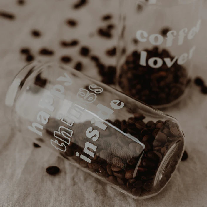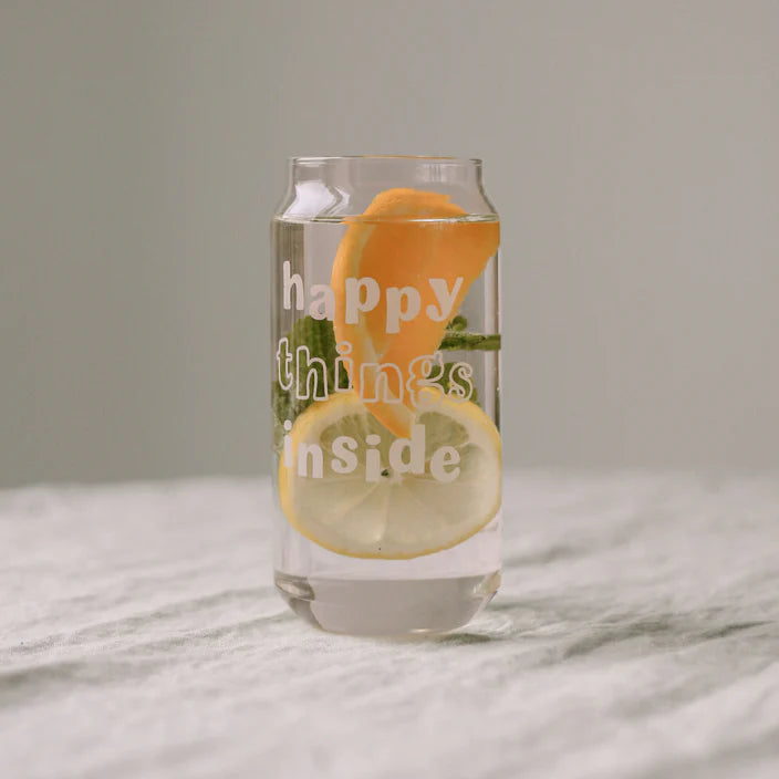 Mit unseren hohen Trinkgläsern kommt richtiges Sommer-Feeling auf. Mit ihren großen Gute-Laune-Prints sind sie perfekt geeignet für selbstgemachte Limonaden, Eistees, deine Lieblings Sommer-Cocktails oder leckere Milchshakes. Für unvergessliche Momente auf dem Balkon am Morgen oder gemütliche sommerliche Abende ist unser Glas mit dem Schriftzug Happy Things Inside einfach toll. Das Besondere an den Gläsern: Die Dosenform zusammen mit dem weißen Print machen die Gläser zu absoluten Hinguckern.