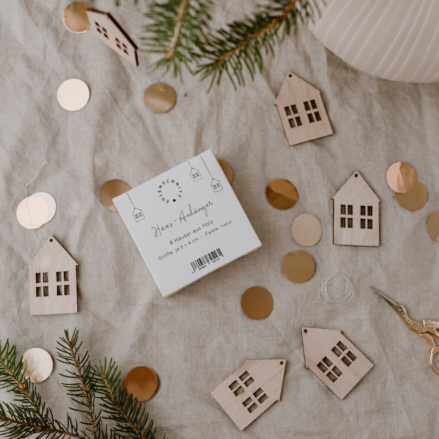 Hast du Lust auf minimalistisch schöne Dekoration – dann werden Dir unsere Holzanhänger Haus richtig gut gefallen! Ihr schlichtes, zeitloses aber dennoch verspieltes Design passen super in jeden Raum. Gern können unsere lasergecutteten Holzanhänger auch noch beschrieben oder bemalt werden. Mit einem Kreidestift kann man sie auch mehrfach bemalen & einfach abspülen. Ausserdem ist in jedem der kleinen Anhänger ein Loch eingefräst, sodass ein beliebiges Band durchgezogen werden kann. Ein dünnes weißes Garn findest Du in jeder Verpackung zu den Anhängern dazu, sodass Du mit dem Aufhängen sofort loslegen kannst. Eine wundervolle Dekoration, welche Du ganz nach Belieben individuell dekorieren kannst.
