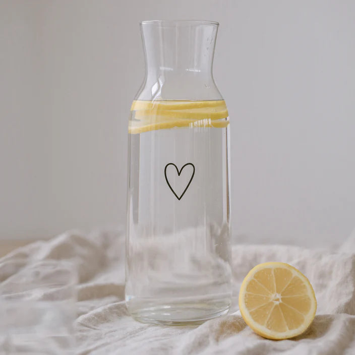 Entdecke unsere wundervolle Karaffe mit schwarzem Design an der Glaswand. So schmeckt das Wasser, die selbstgemachte Zintronen-Limonade, der frisch gepresste Saft, der Wein oder vieles mehr doch gleich noch viel besser. Diese Karaffe ziert ein wundervolles Herz und macht den Wasserkrug zu einem ganz besonderer Hingucker auf deinem Frühstücks- oder Abendtisch!
