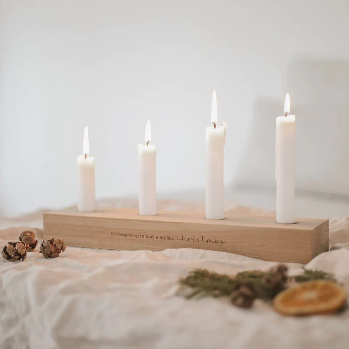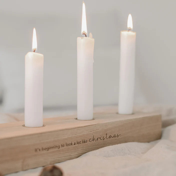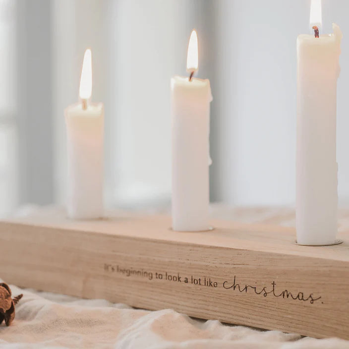 Für die weihnachtliche Stimmung und die gemütliche Adventszeit ist unser schlichtes und minimalistisches Adventskerzenbrett genau das Richtige. Der eingefräste Spruch "It's beginning to look a lot like christmas" bringt Weihnachtsstimmung und Vorfreude auf die Zeit mit deinen Liebsten. Mit den kompakten Maßen von 35 x 8 x 4 cm passt es an jeden Lieblingsort - ob Couchtisch, Esstisch, Kommode, Fensterbank oder Regalbrett. So machen die Adventssonntage doch gleich noch viel mehr Spaß!