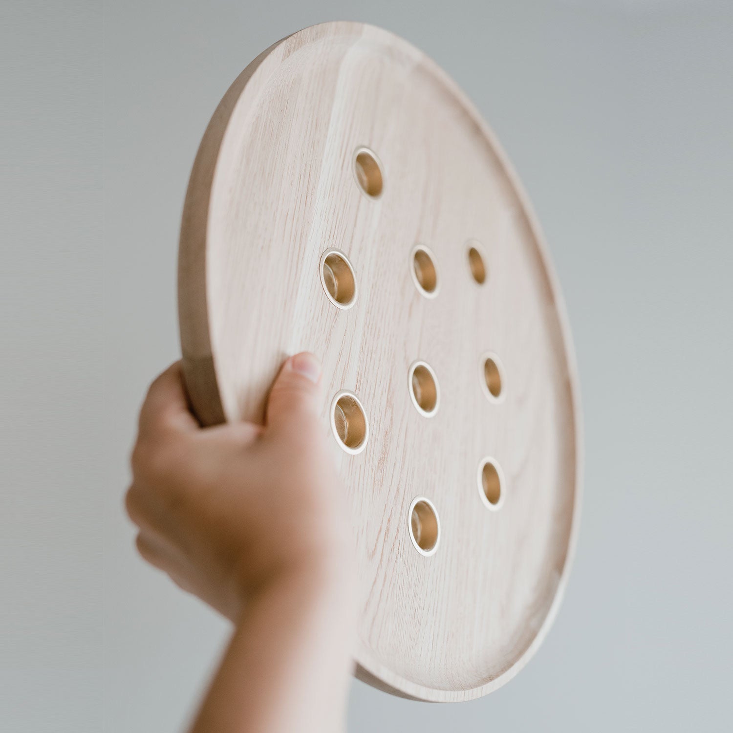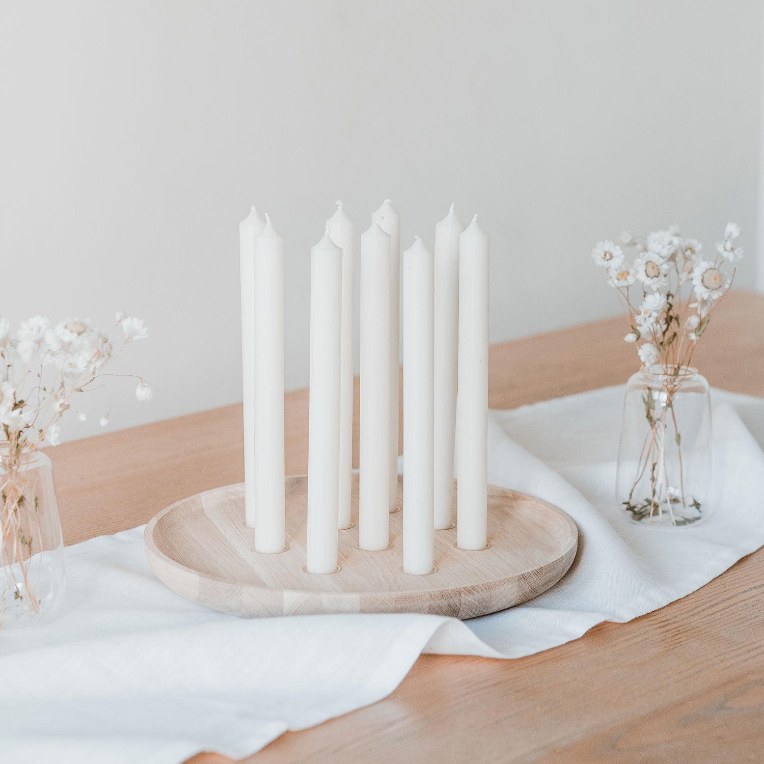 Mit Platz für insgesamt 9 Kerzen erstrahlt jedes Zimmer in wunderschönem, sanftem Licht. Mit einem Durchmesser von 32 cm und einer Höhe von 3 cm hat unser rundes Kerzenbrett aus Eiche eine tolle Größe um es sowohl auf dem Esstisch oder aber auch auf Deiner Lieblingskommode zu dekorieren. Die goldenen Kerzentüllen sind mittig verteilt, sodass auf dem Tablett noch genügend Platz zum Dekorieren ist. So kannst Du die Kerzen immer wieder saisonal oder nach belieben in Szene setzen. Durch das sonst schlichte Design passt unser rundes Kerzenbrett aus Eichenholz super in jeden Raum und schafft eine tolle gemütliche Atmosphäre.