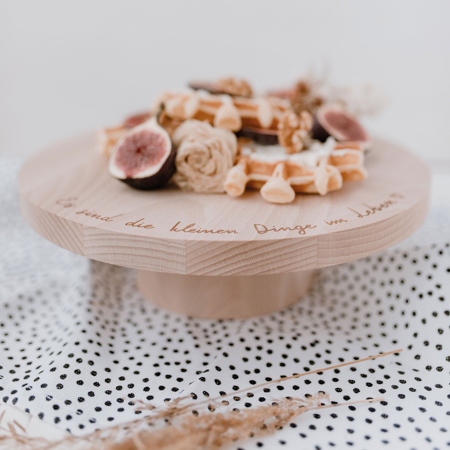 Mit unserem Kuchenständer aus Holz bekommt Dein selbst gebackener Kuchen genau den Auftritt, den er verdient hat! Die Tortenplatte hat einen Durchmesser von 28 cm und eine Stärke von 2 cm. Durch den Fuß erhält der Kuchenständer eine tolle Höhe und lässt jeden Geburtstagskuchen auf dem Geburtstagstisch erstrahlen. Das besondere Etwas bringt der Spruch “Die Kleinen Dinge im Leben”, welcher in liebevoll designter Schrift auf der Kuchenplatte eingraviert ist.