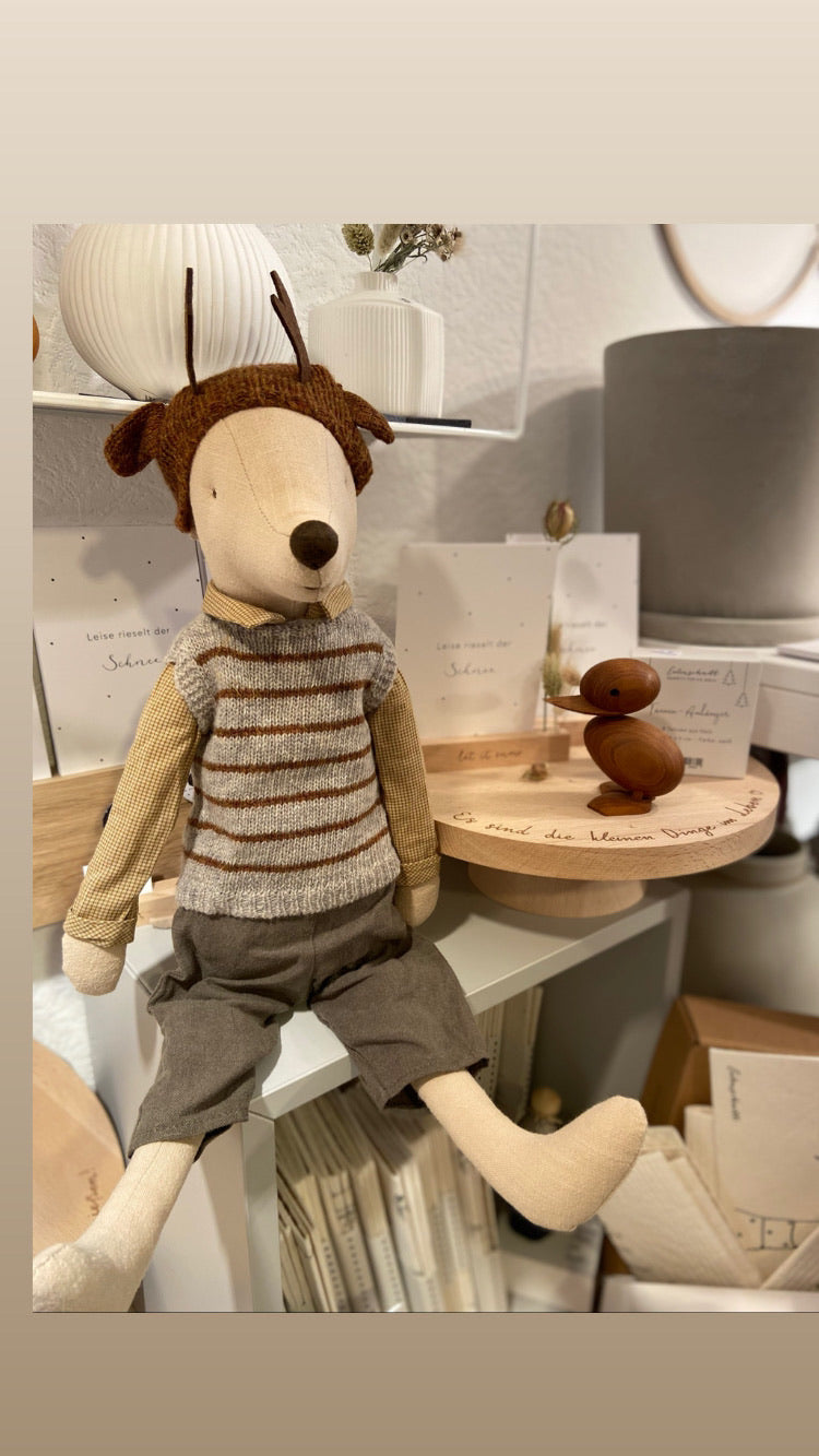 MAXI MAUS - JUNGE Dieser Maxi-Mausjunge trägt sein feinstes Hemd und die weiche Lammwolle West. Die Hose ist lässig geschnitten und seine Strickmütze rundet den Look ab.