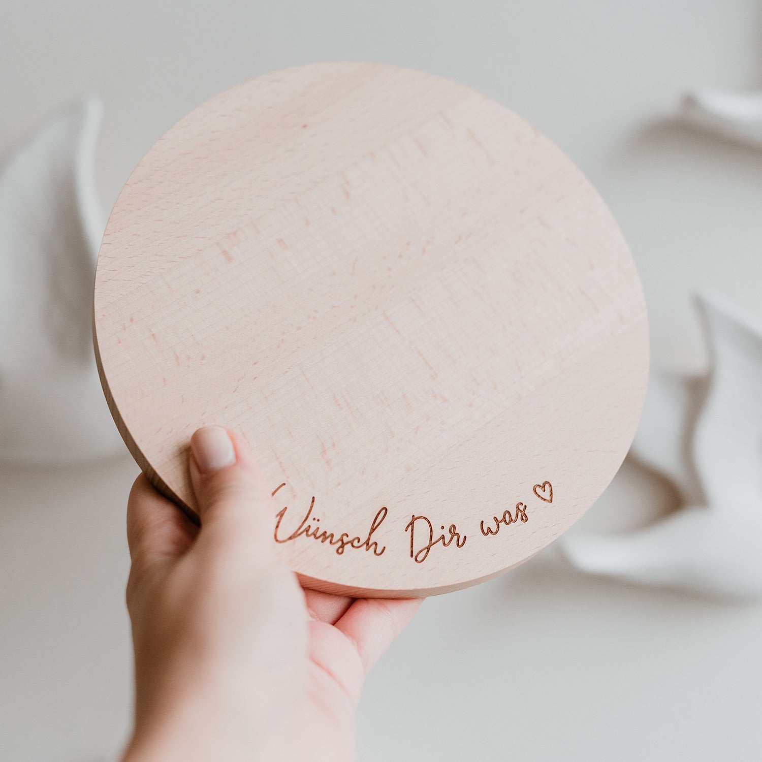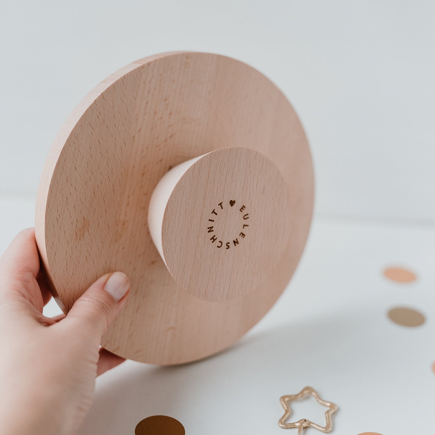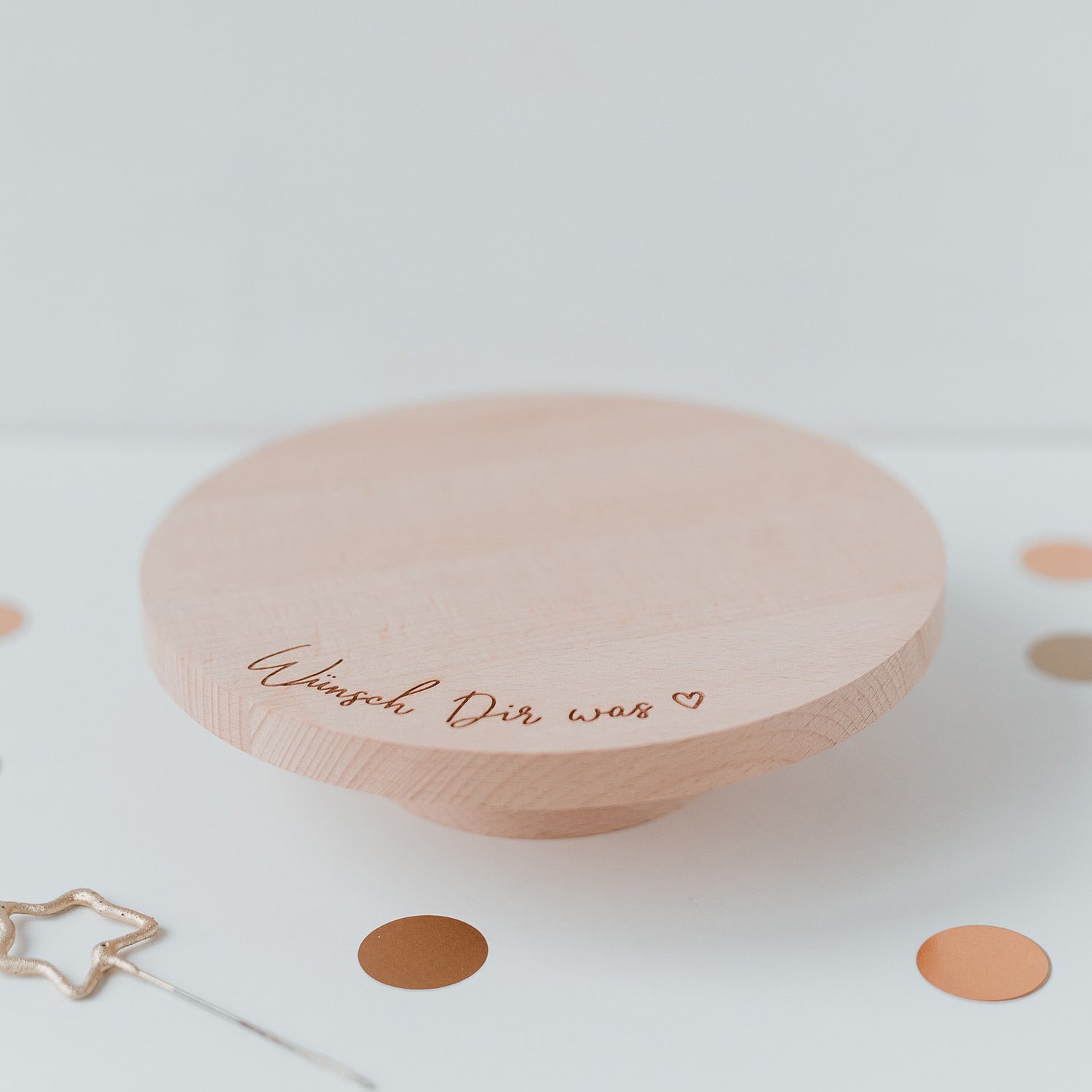 Mit unserem Kuchenständer Wünsch Dir Was aus Holz bekommt Dein selbst gebackener Kuchen genau den Auftritt, den er verdient hat! Die Tortenplatte hat einen Durchmesser von ca. 17 cm und eine Stärke von ca. 1,2 cm. Durch den Fuß erhält der Kuchenständer eine tolle Höhe und lässt jedes kleines Geburtstagstörtchen auf dem Geburtstagstisch erstrahlen. Das besondere Etwas bringt der Spruch “Wünsch Dir Was”, welcher in liebevoll designter Schrift auf der Kuchenplatte eingraviert ist. Solange Du den Kuchenständer nicht in Gebrauch hast, eignet er sich auch super als Dekoration auf dem Tisch mit Blumen oder Ähnlichem.