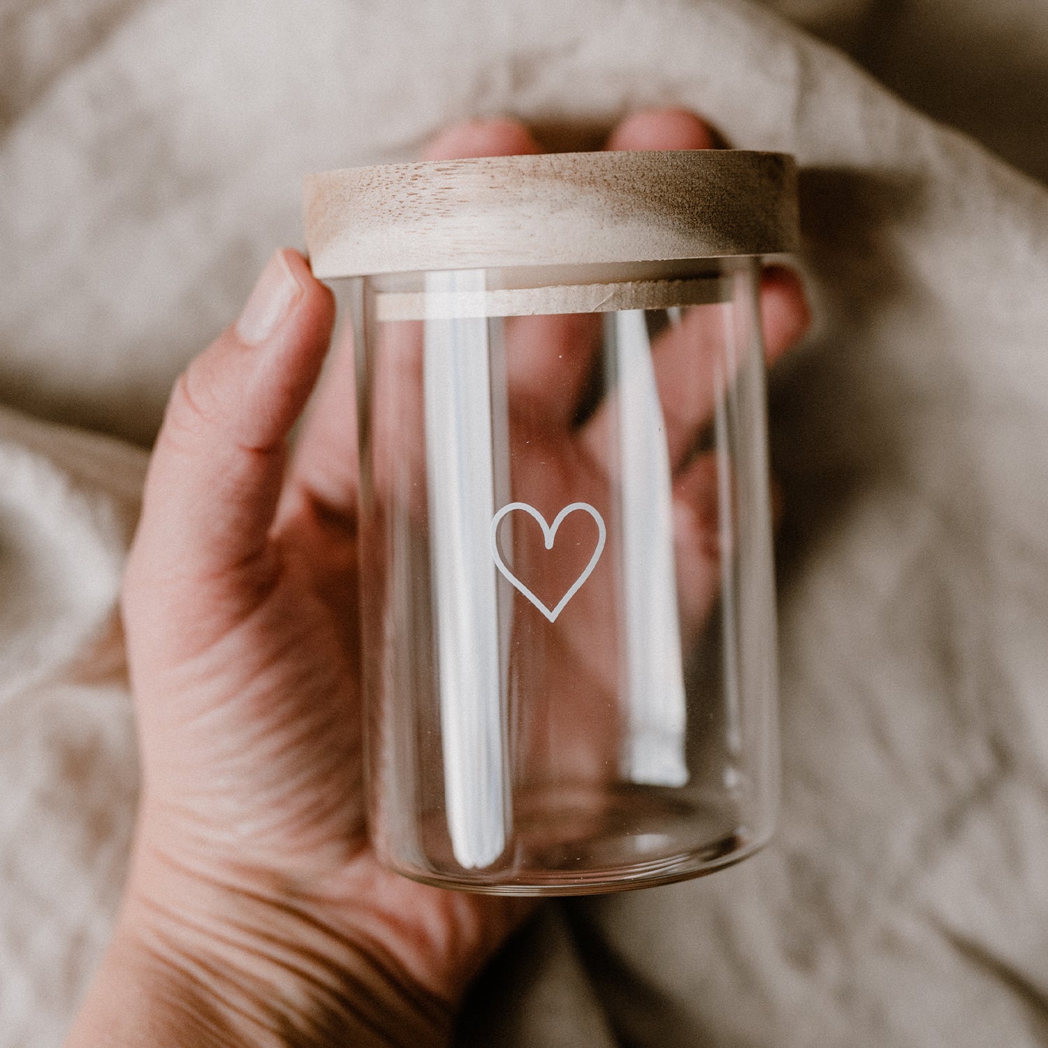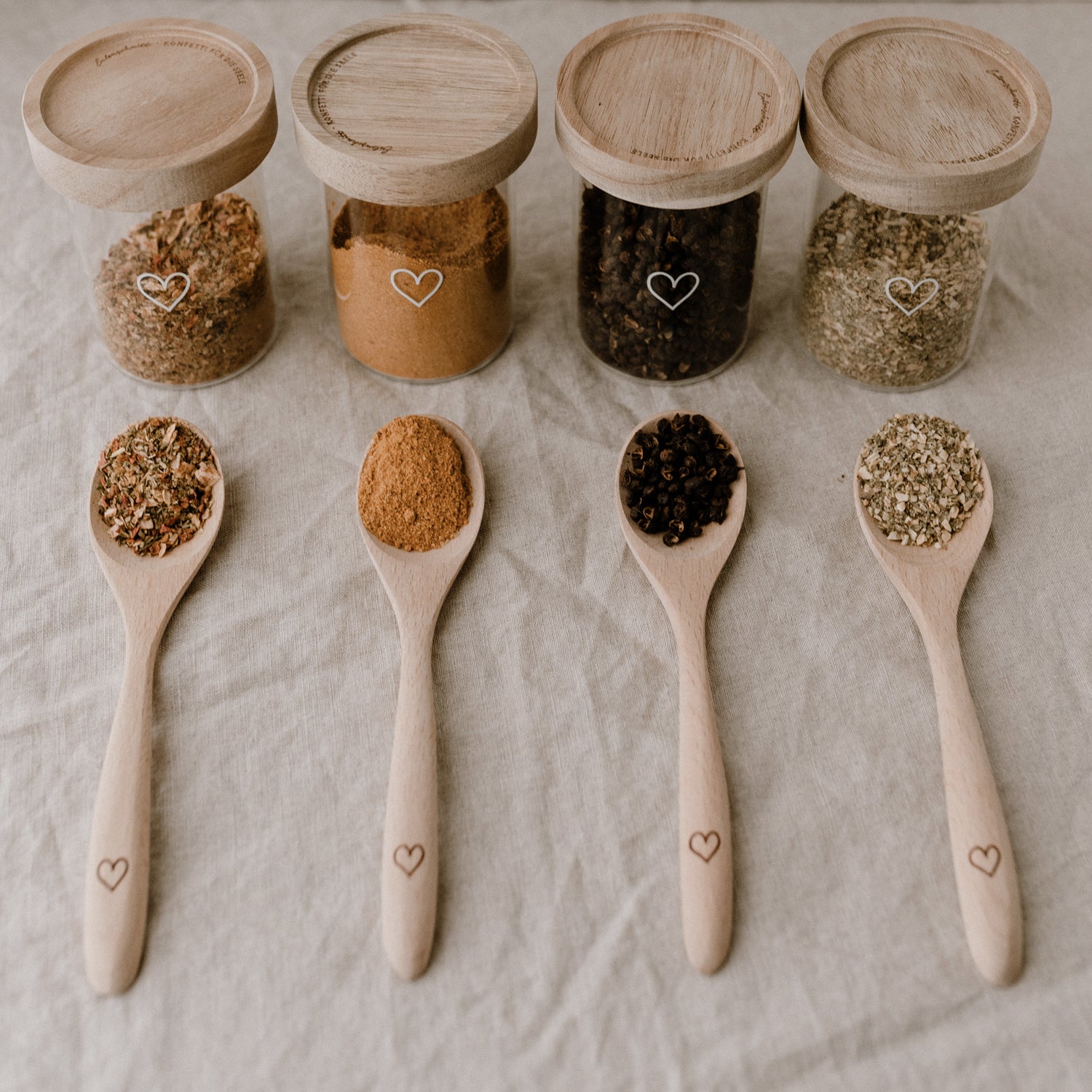 Entdecke unsere wunderschönen und praktischen Mini Vorratsgläser Herz 9cm im 6er Set aus Borosilikatglas mit Akazienholz Deckel.