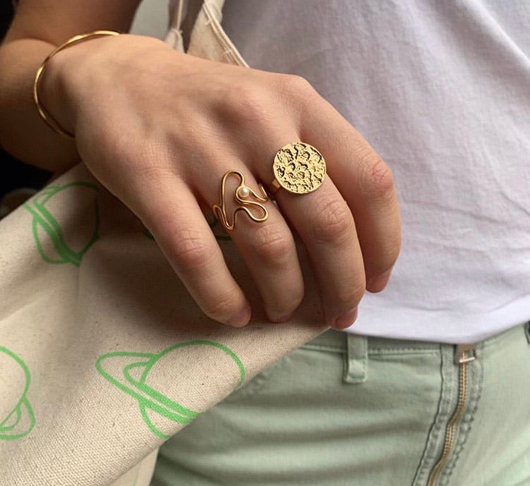 Die einzigartige Oberfläche des New Moon Ring von PERNILLE CORYDON erinnert an eine unruhige Mondlandschaft, inspiriert durch die Vulkane Hawaiis.