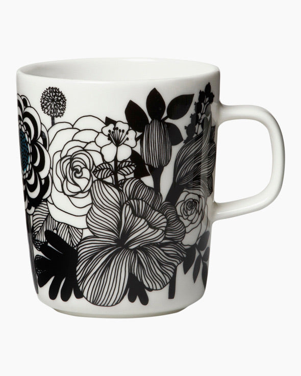 Dieser weiße Steinzeugbecher kennzeichnet ein Siirtolapuutarha-Motiv der blühenden Blumen.