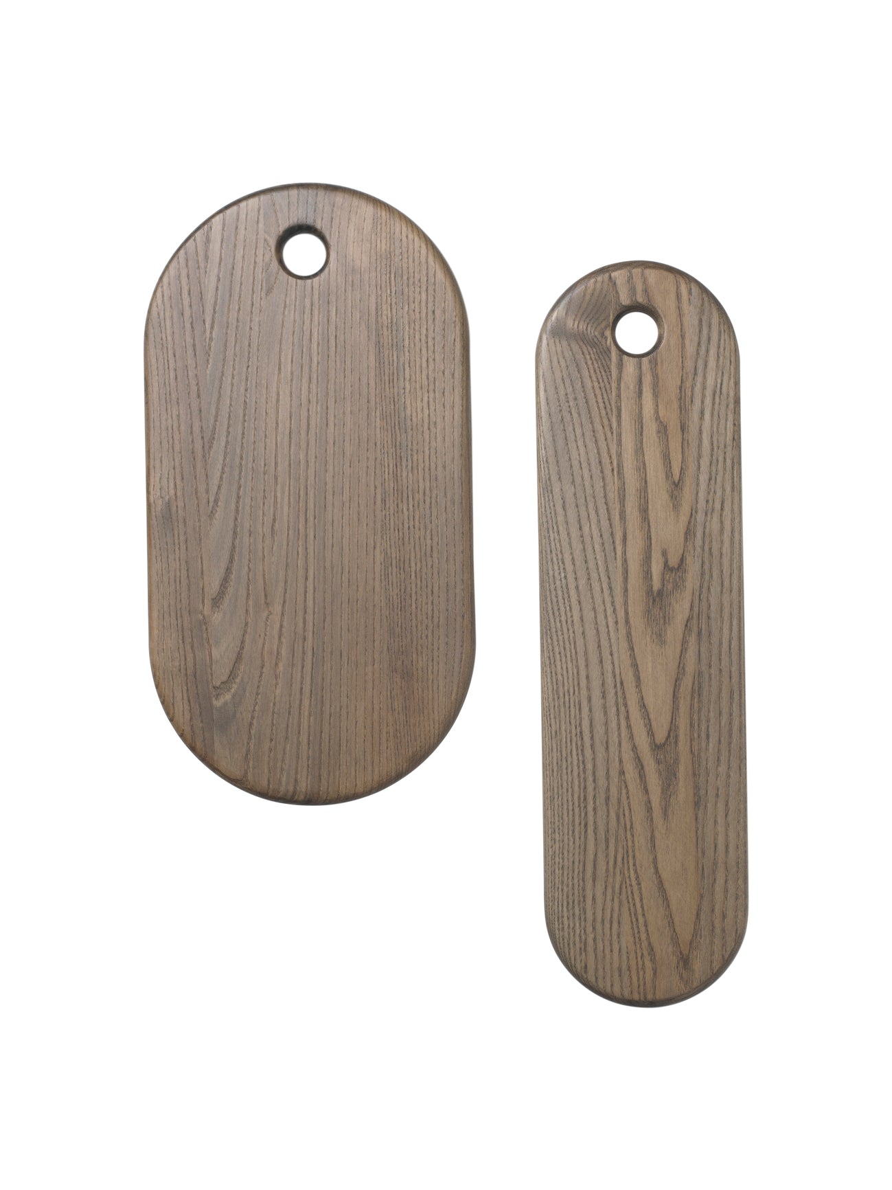 Mit diesem Paar aus einer kleinen und größeren länglichen Platte erhältst du ein praktisches Set, das Schönheit in den Küchenalltag bringt. Verwende sie als Schneidebretter oder als moderne Servierplatten für den Brunch oder Abendessen. Sie sind aus Eschenholz gefertigt, das mit einem speziellen Lack behandelt wurde, um den grauen, rustikalen Look zu erreichen, der gleichzeitig die natürliche Textur des Holzes bewahrt. Durch die Löcher kannst du sie an einem Haken aufhängen, sodass sie wenig Platz in der Küche einnehmen.