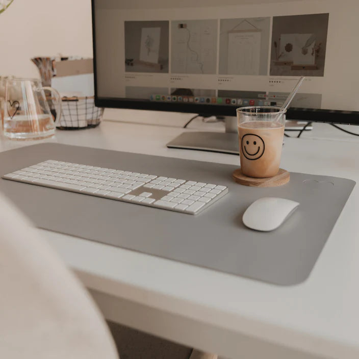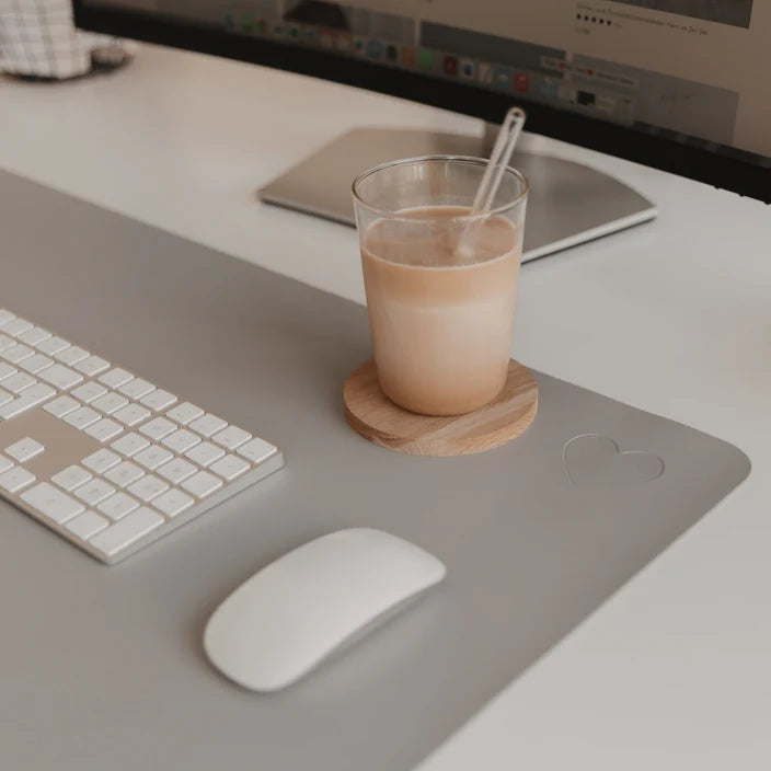 Unsere Schreibtischunterlage Herz grau bringt stilvolle Ordnung und ein ruhiges, modernes Flair an deinen Arbeitsplatz. Hergestellt aus hochwertigem Lederimitat überzeugt sie durch ihre schlichte Eleganz, gepaart mit durchdachter Funktionalität.