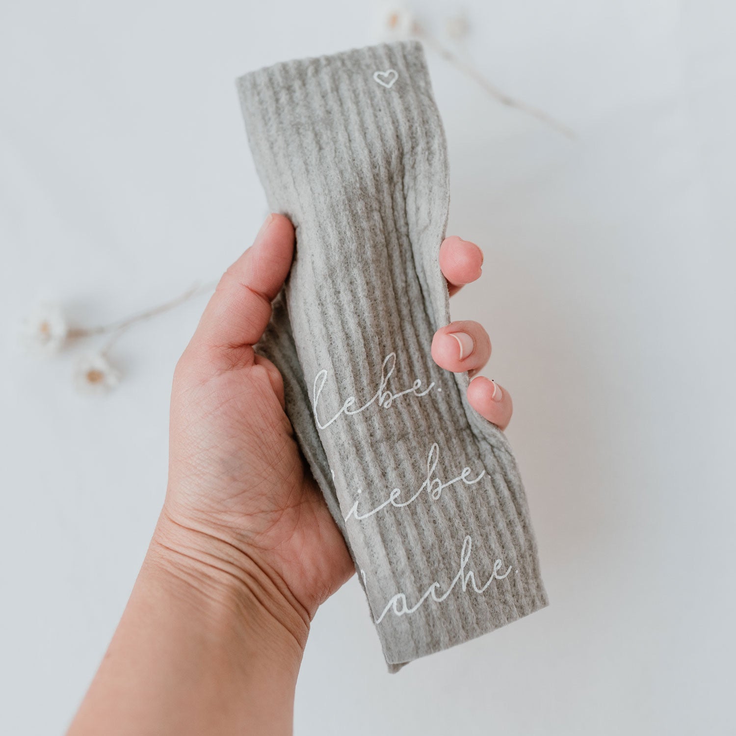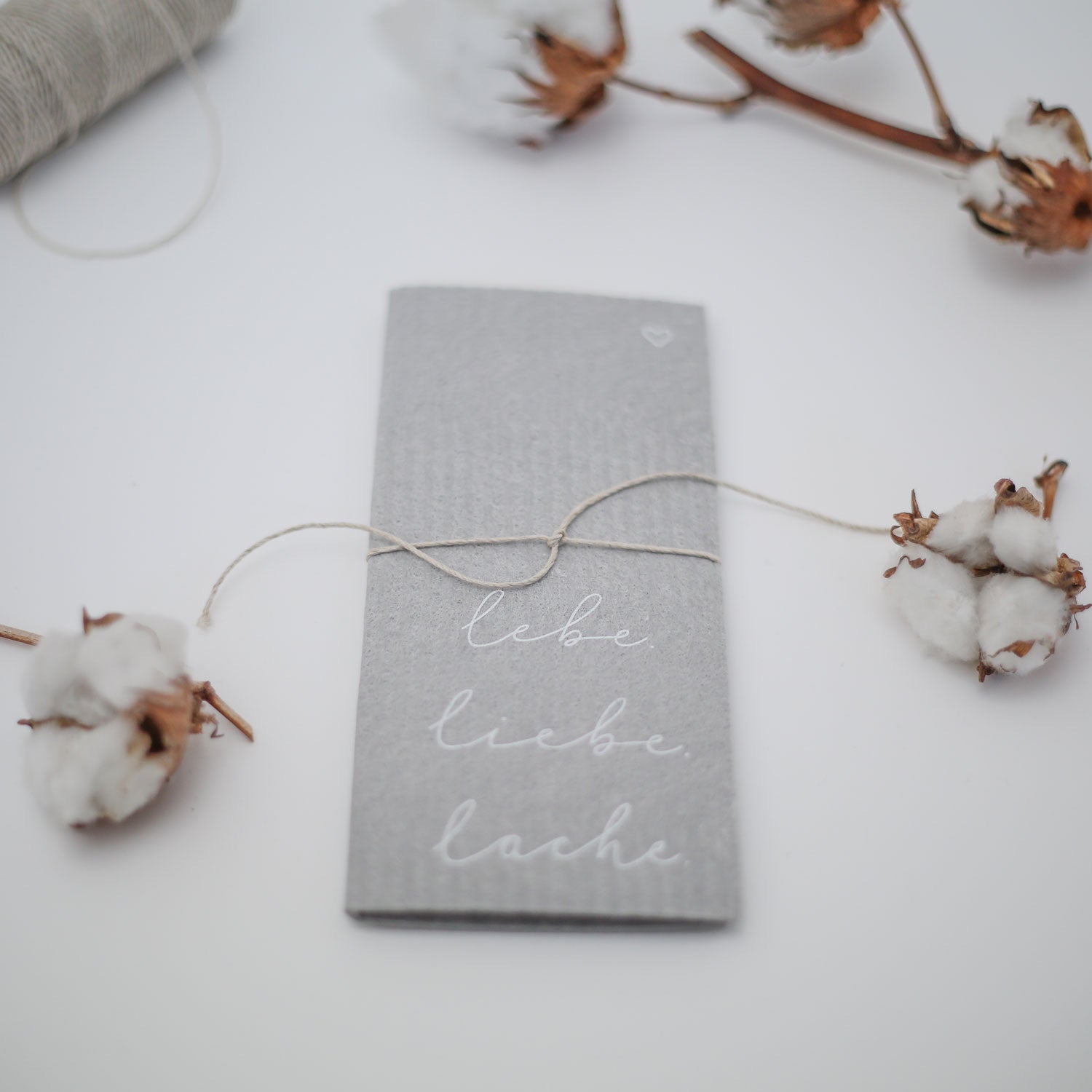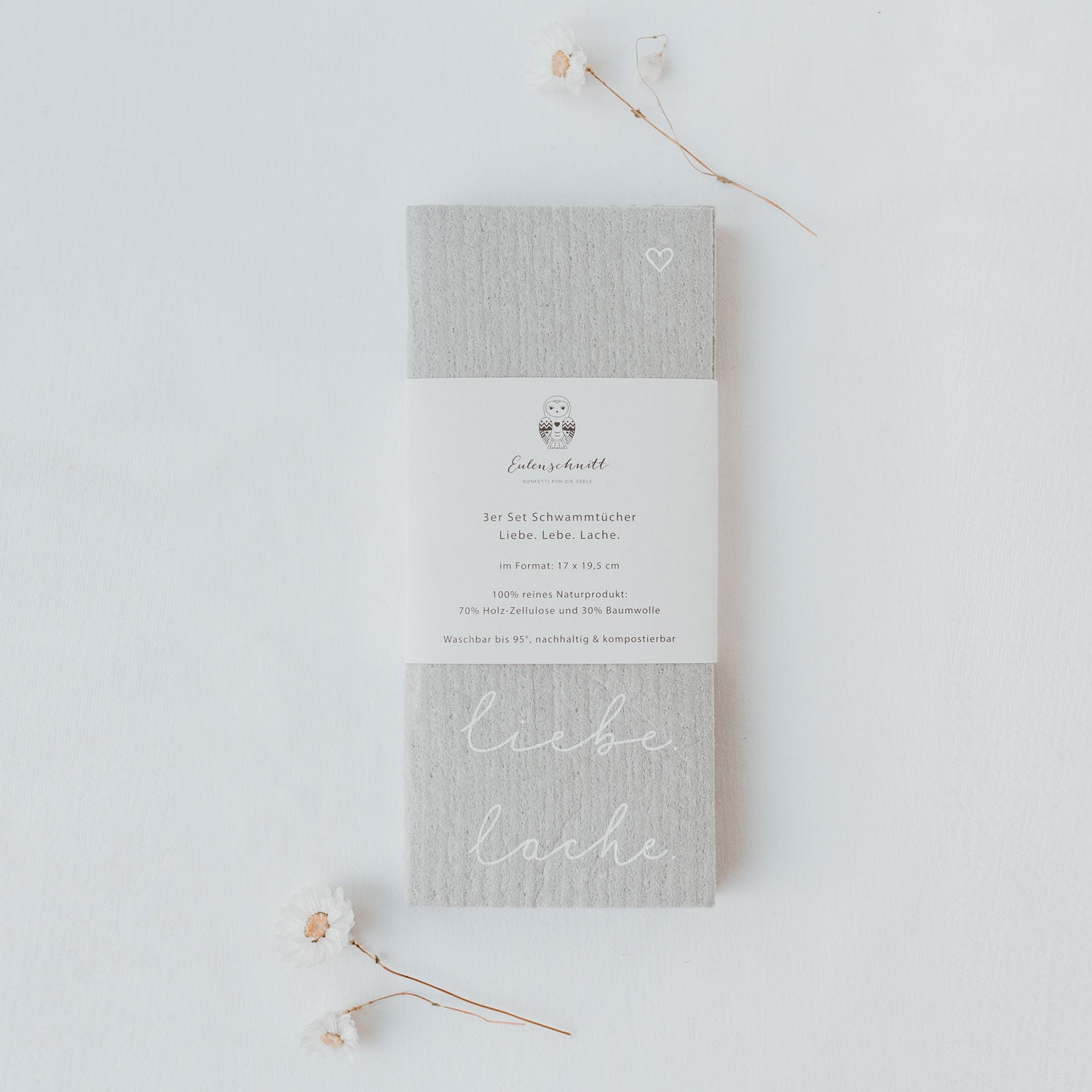 Du möchtest etwas Schwung in Deine Küchen bringen? Dann sind unsere Schwammtücher genau das Richtige für Dich. Sie sind nicht nur optisch ein echtes Highlight, sondern sind durch ihr besonderes Material auch besonders saugfähig und fusselfrei. Unsere Schwammtücher Lebe Liebe Lache haben einen tollen hellen Grauton. Der handgeschriebene Schriftzug “lebe. liebe. lache.” in Weiß ziert die untere rechte Ecke.