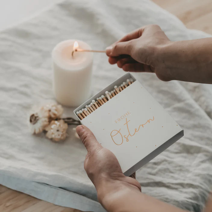 Die Streichhölzer selbst sind nicht nur praktisch, sondern auch ein stilvolles Highlight. Mit einer Überlänge von ca. 9,5 cm und weißen Zündköpfen setzen sie farblich abgestimmte Akzente. Ideal für Osterkerzen oder als besonderes Detail in deiner Frühlingsdeko.