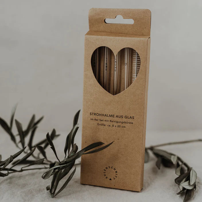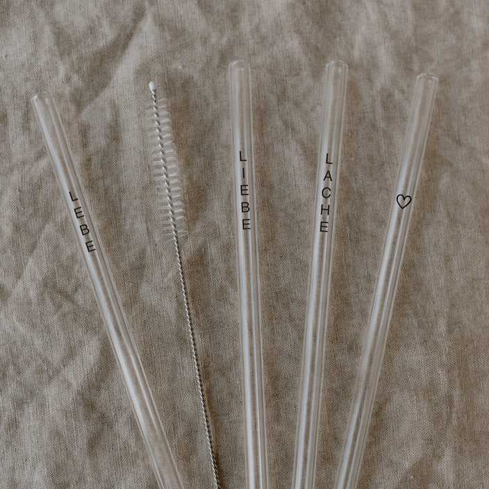 Mit unseren nachhaltigen und umweltfreundlichen Strohalme aus widerstandsfähigem Borosilikatglas habt ihr die perfekte Alternative zu den allbekannten Einweg-Plastikstrohhalmen. Sie sind zudem super stabil und hitzebeständig. Unsere Strohhalme Lebe Liebe Lache haben eine Länge von 20cm. Jeder Strohhalm ziert ein anderer wundervoller Print, so sieht euer Getränk nicht nur optisch toll aus, sondern ihr könnt es auch immer sofort von den anderen Gläsern und Getränken auf dem Tisch unterscheiden! Nach der Benutzung könnt ihr die Strohhalme einfach mit der beiliegenden Bürste sauber machen oder ihr reinigt sie ganz einfach in der Spülmaschine. Unser Set besteht aus 4 Strohhalmen mit unterschiedlichen Gravuren sowie einer Bürste um Reinigen.
