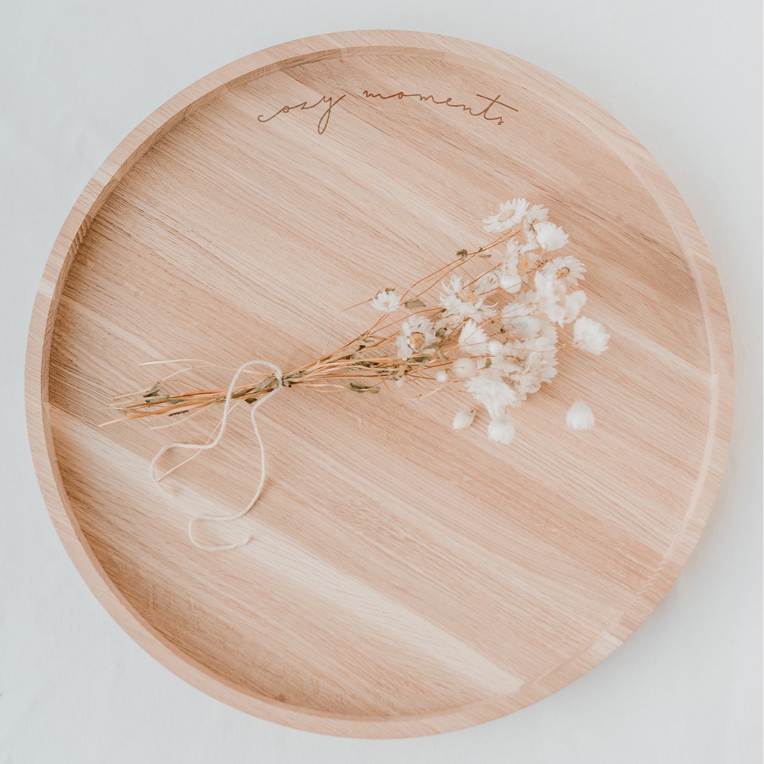 Unser Tablett Cozy Moments ist nicht nur ein absoluter Hingucker, sondern hat dazu noch eine super Größe um Deinen Liebsten Ihren Kaffee, Kakao und gesunden Snack zu bringen. Mit einem Durchmesser von 36cm bietet das Tablett Cozy Moments genügen Platz für Teller, Tasse und Co. Die Innenseite des Tablettes ziert der handgeschriebene Spruch “Cozy Moments”. Auf der Unterseite sind kleine Gumminoppen eingearbeitet, sodass das Tablett am Platz gehalten wird und nicht so leicht verrutschen kann. Du kannst es nicht nur als normales Tablett für das nächste Frühstück im Bett nutzen, sondern auch super als Dekotablett für Öle und Gewürze in der Küche oder für Deine Lieblingsvasen im Wohnbereich. Ein absoluter Allrounder, der Dir immer wieder ein Lächeln ins Gesicht zaubert und dich entspannte Momente genießen lässt.