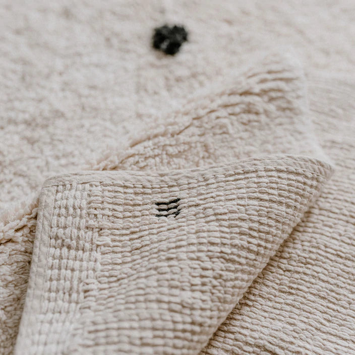 Unser großer Webteppich Punkte aus Baumwolle ist ein totales Highlight für jeden Raum! Seine super weiche Haptik und unser charakteristisches Punktedesign machen ihn zu einem ganz besonderen Liebhaberstück. Ob im Schlafzimmer, im Kinderzimmer oder im Büro - der Teppich Punkte sorgt überall für Wohlfühl-Momente. Und nicht nur das: er ist nicht nur optisch ein Highlight, sondern zudem auch besonders pflegeleicht, denn Du kannst den Teppich einfach in der Waschmaschine waschen. Das Format von 140 x 200 cm ist ideal um es sich auch einmal auf dem Teppich mit den Kleinen bequem zu machen.
