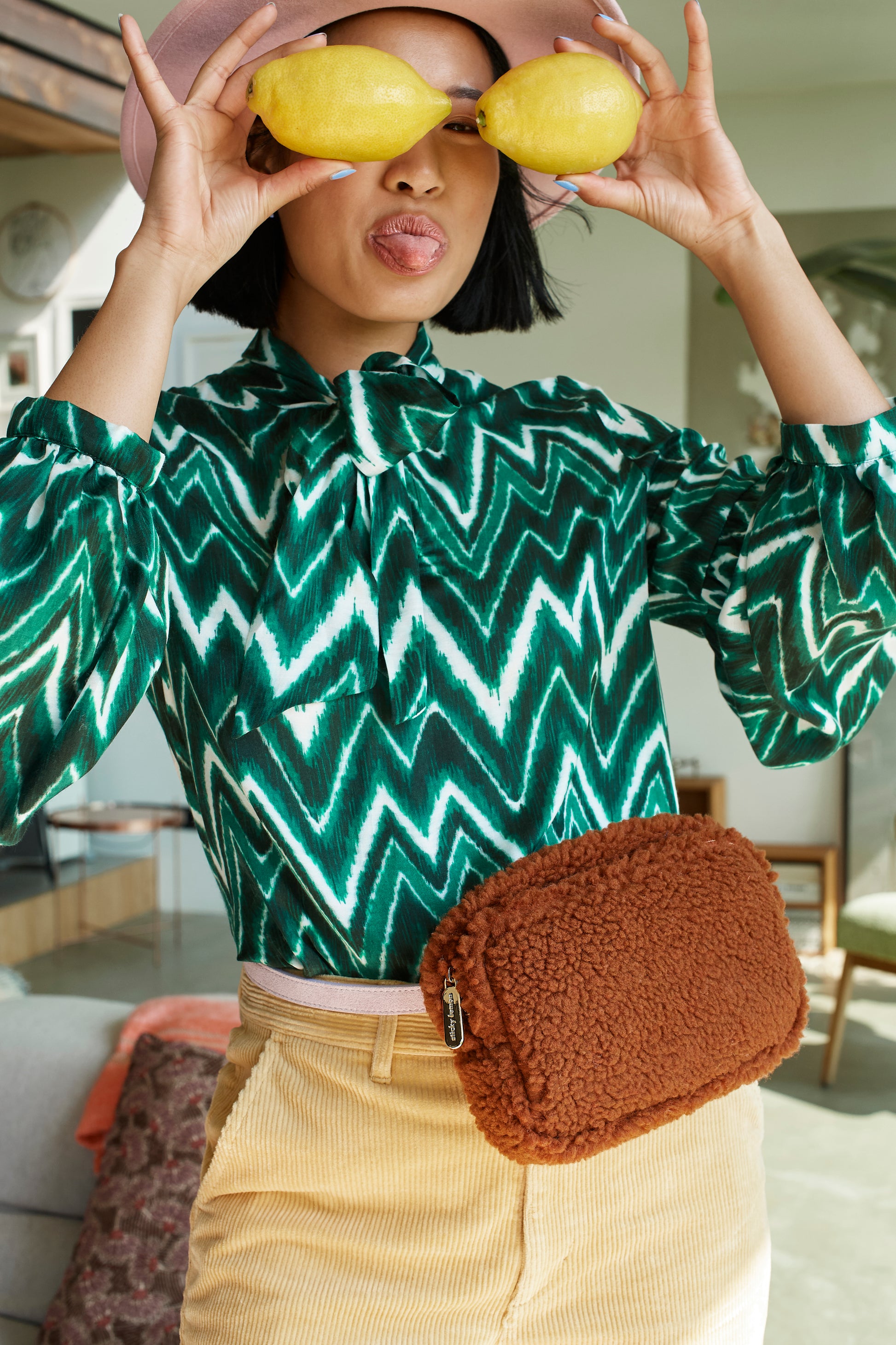 Die Tasche ist aus hochwertigem Teddystoff gefertigt und hat einen Hüftgurt aus echtem Wildleder. Das Innenfutter besteht aus einem coolen & schicken gestreiften Canvas.