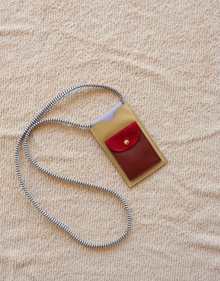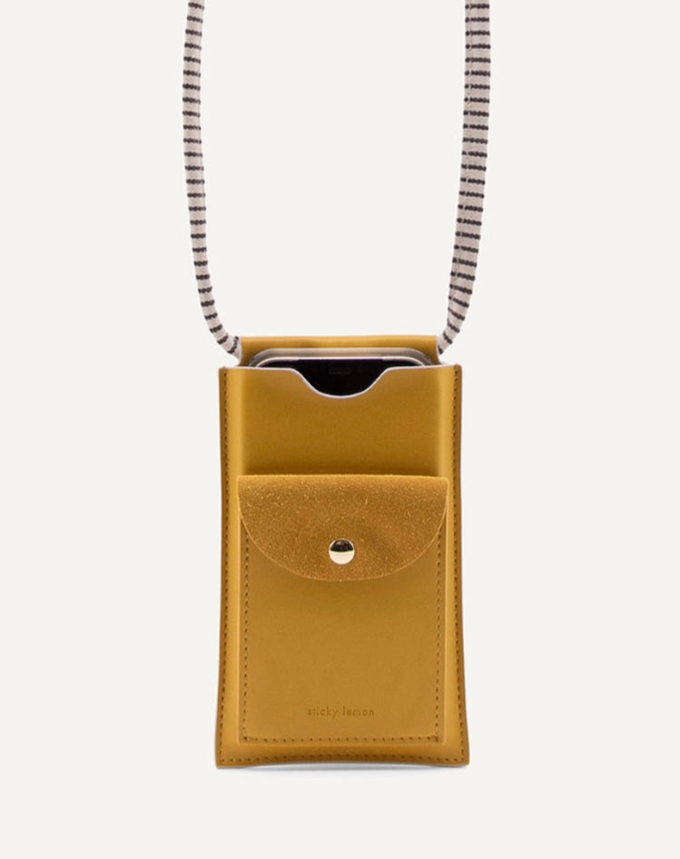 Eine honiggoldene & frühlingsrosa Handytasche mit einem coolen gestreiften Canvas-Griff. Das Etui ist aus hochwertigem veganem Leder gefertigt und hat eine echte Wildlederklappe.