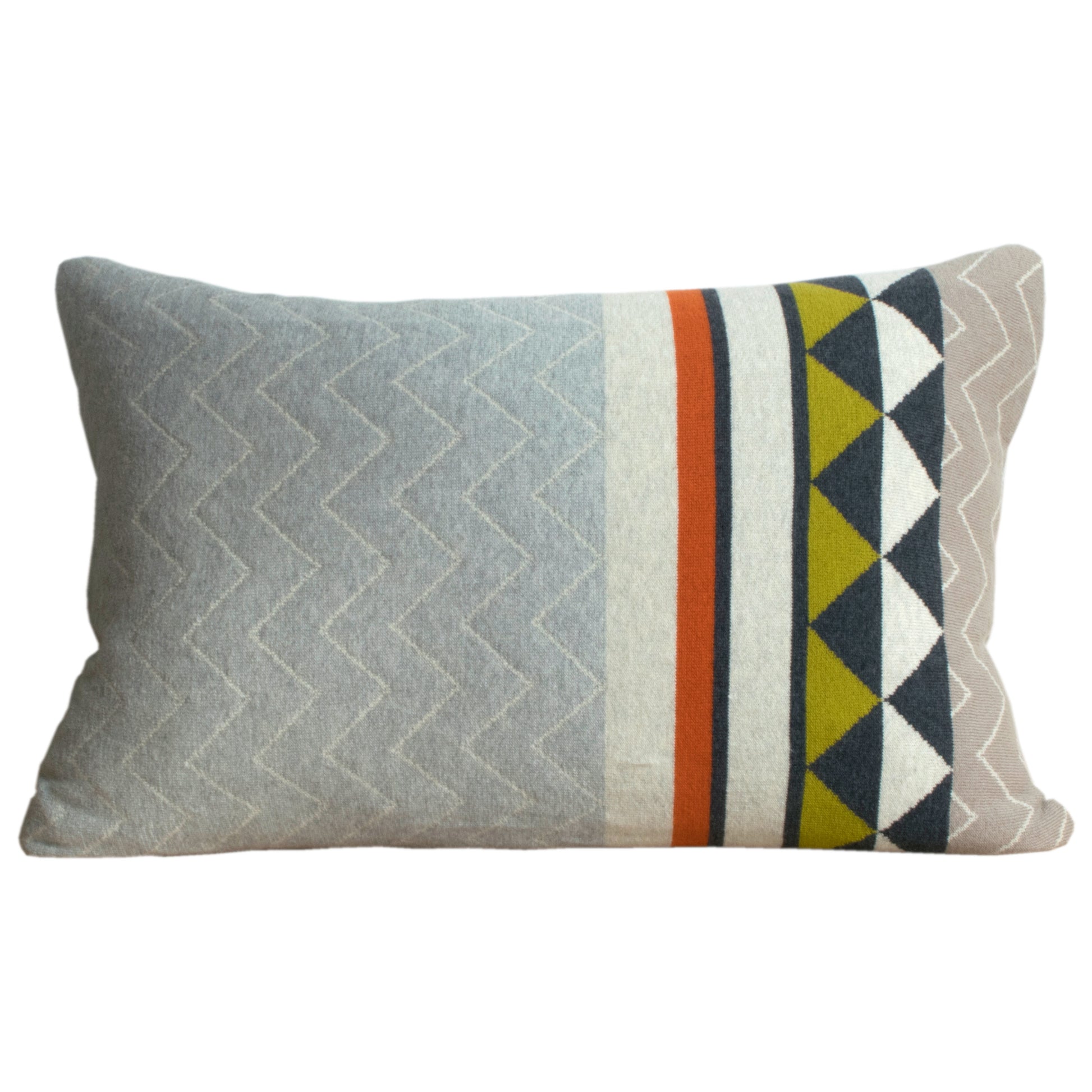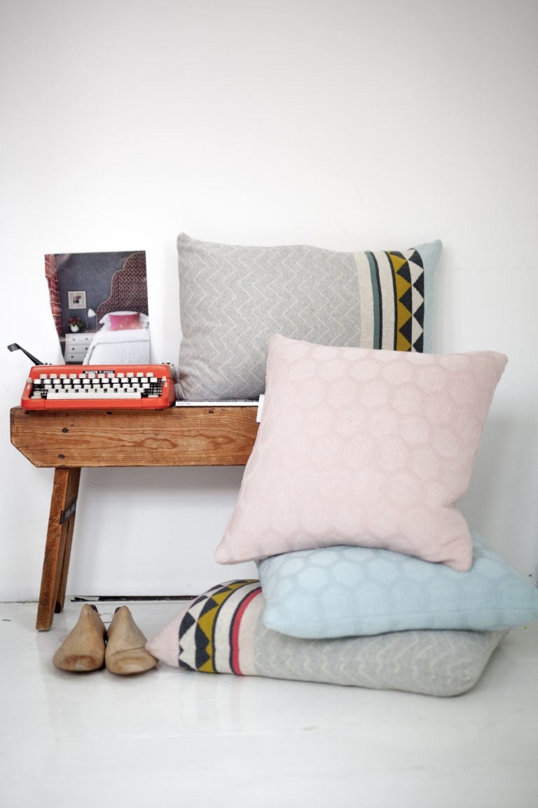 Decken und Kissen Vilma sind Strickwaren, hergestellt in der Jacquardtechnik. Es wird mit bunten Fäden gearbeitet, die beim Farbwechsel kunstvoll verkreuzt werden. Diese Umkehrung der Farben schafft einen umwerfenden grafischen Effekt mit verschiedener Vorder- und Rückseite.
