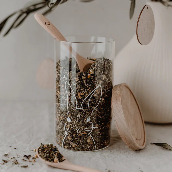 Entdecke unser wunderschönes und praktisches Vorratsglas Hasi 19 cm aus Borosilikatglas mit Akazienholz Deckel.