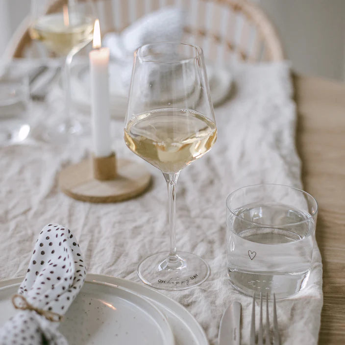 Entdecke ein wundervolles Weinglas mit schwarzem Druck am Glasboden. Unsere neuen Weingläser sind dünnwandig, dadurch leicht und dennoch extrem stabil. Genau das macht sie in Verbindung mit dem minimalistischem Design so besonders. Sie haben ein Füllvolumen von ca. 390ml, das macht sie zu einem absoluten Allrounder - egal ob Weißwein, Rotwein oder Rosé. Das Glas ziert der handgeschriebene Spruch "Oh happy Day" am Weinboden, so springt es dezent ins Auge wenn das Weinglas am Tisch dekoriert ist und zaubert jedem Gast ein Lächeln ins Gesicht. Einfach ein ganz besonderer Hingucker! Das tolle an unseren Weingläser: du kannst sie nach belieben kombinieren und unterschiedliche Designs mit einander mischen. So werden auf der nächsten Party keine Gläser mehr vertauscht!