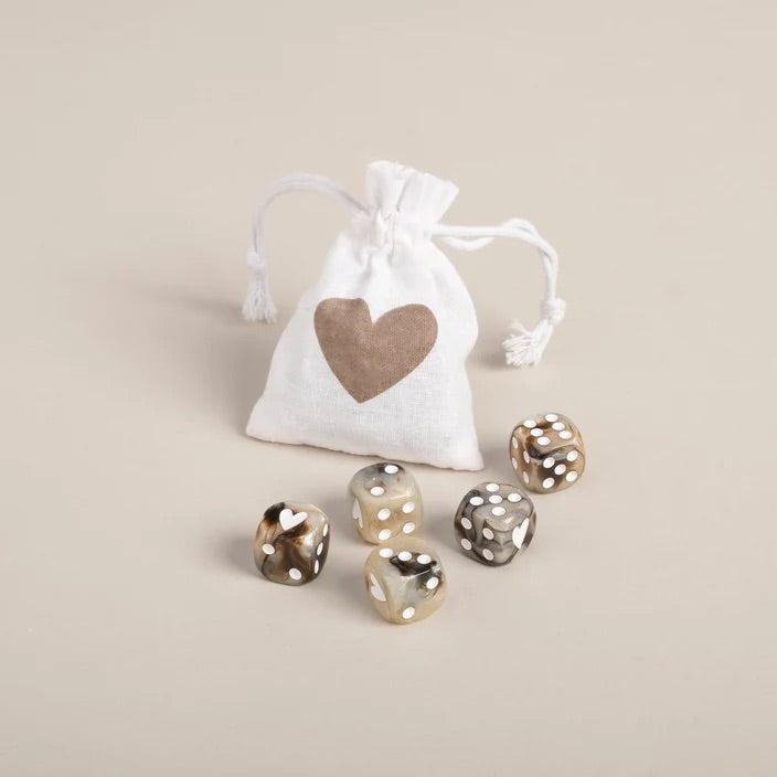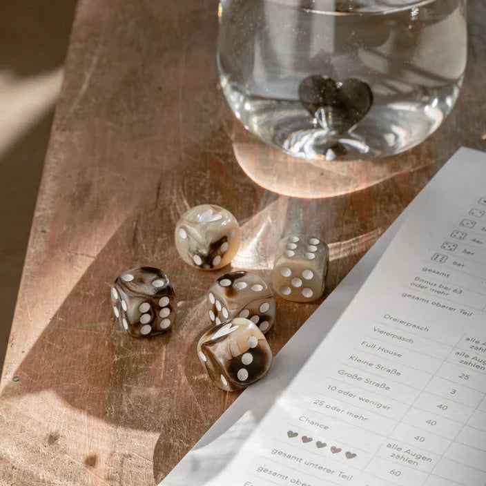 Wir sind einfach begeistert von unserem neuen braunen Würfelset mit Perlmuttstruktur und weißen Zahlen! Diese Würfel bringen eine zusätzliche Dimension des Spaßes in jedes Spiel. Die charmanten Herzen, die die Eins auf jedem Würfel zieren, machen sie wirklich zu einem Blickfang.