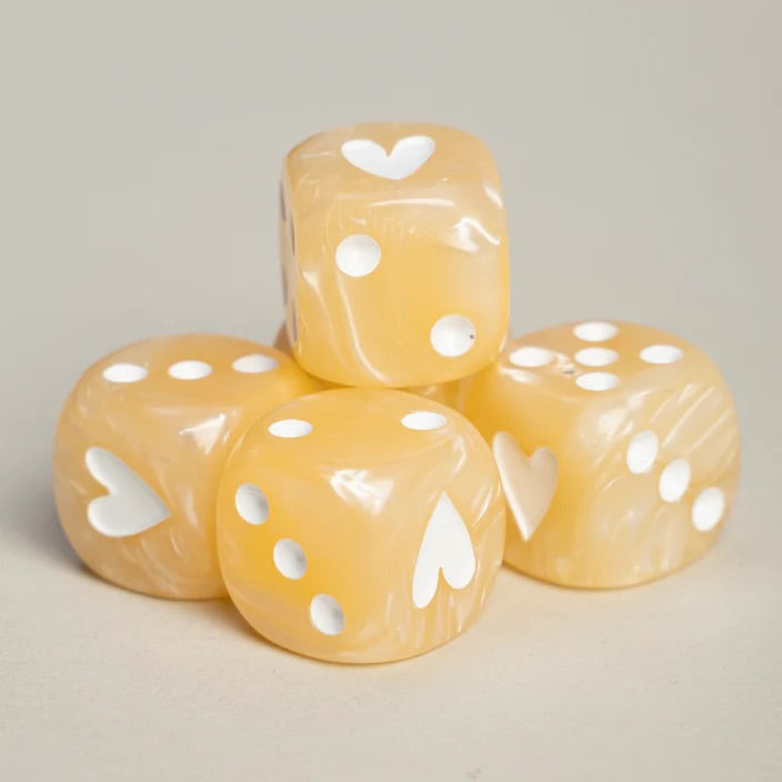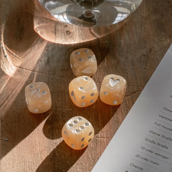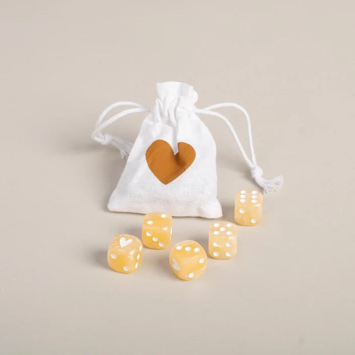 Das Besondere: Kleine Herzchen repräsentieren die Eins auf jedem Würfel. Bewahre sie sicher im entzückenden Stoffbeutel mit Herzprint auf und nimm sie überall hin mit. Perfekt für Spieleabende, Urlaube oder Cafés.