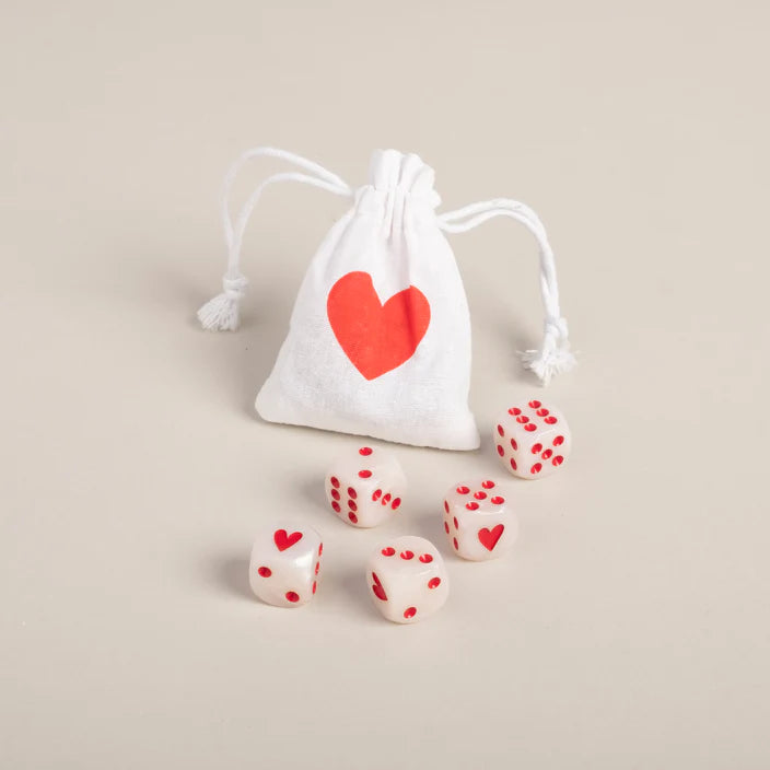 Das ganz besondere Etwas sind die kleinen Herzchen, die die 1 auf dem Würfel darstellen sollen. Die Würfel kannst du immer wieder in dem kleinen tollen Stoffbeutel mit Herzprint aufbewahren und verstauen und so auch überall mit hinnehmen. Ob zu Freunden für einen Spieleabend, in den Urlaub oder auch ins nächste Café.