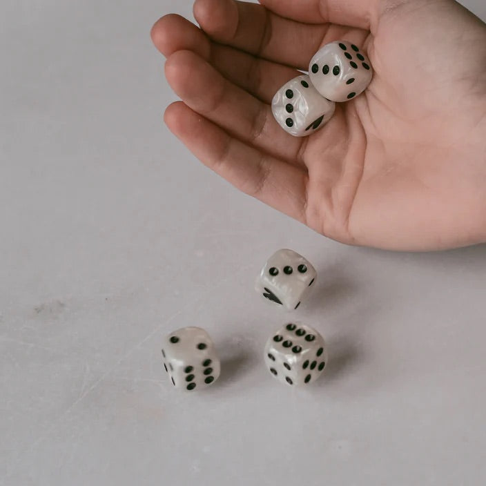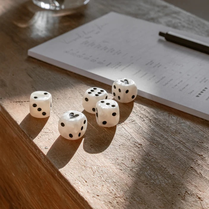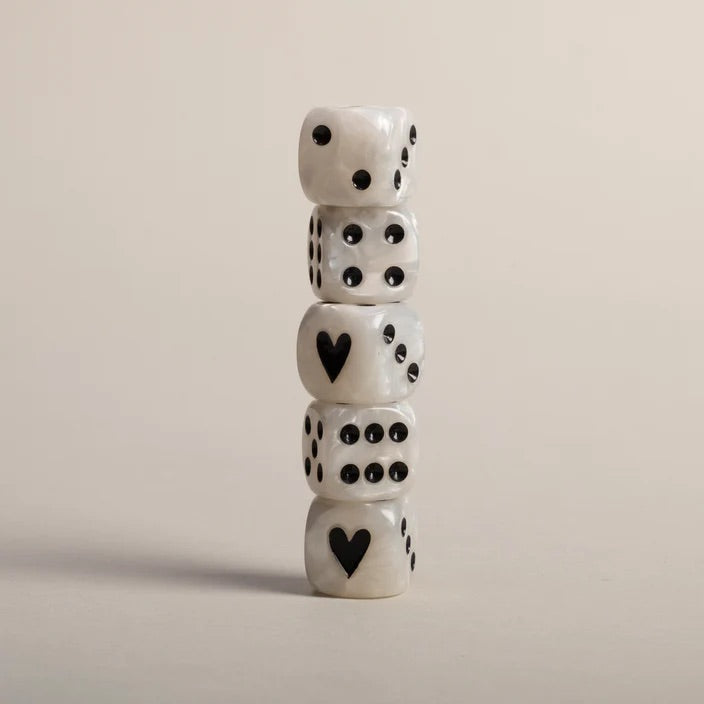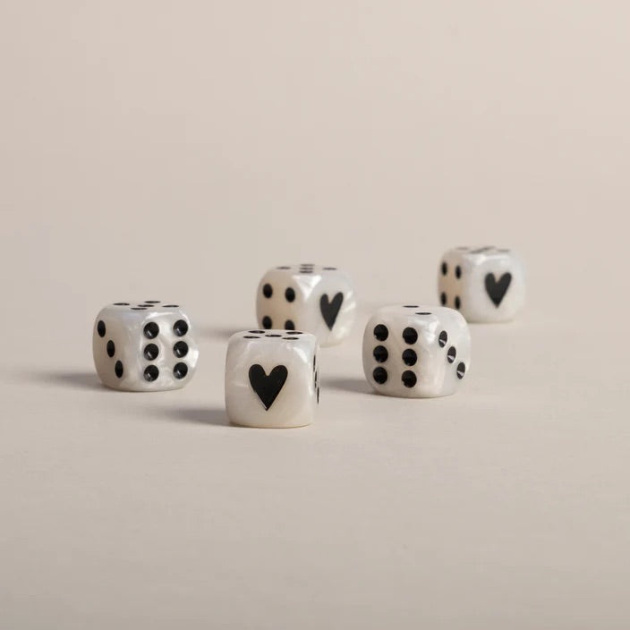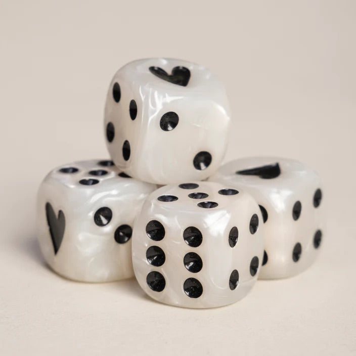 Unser neues Würfelset in Perlmuttfarben mit schwarzen Zahlen hat uns vollkommen verzaubert! Mit diesen Würfeln wird das nächste Spiel gleich noch aufregender. Besonders entzückend sind die kleinen Herzchen, die die Eins auf dem Würfel zieren und ihm eine ganz besondere Note verleihen.